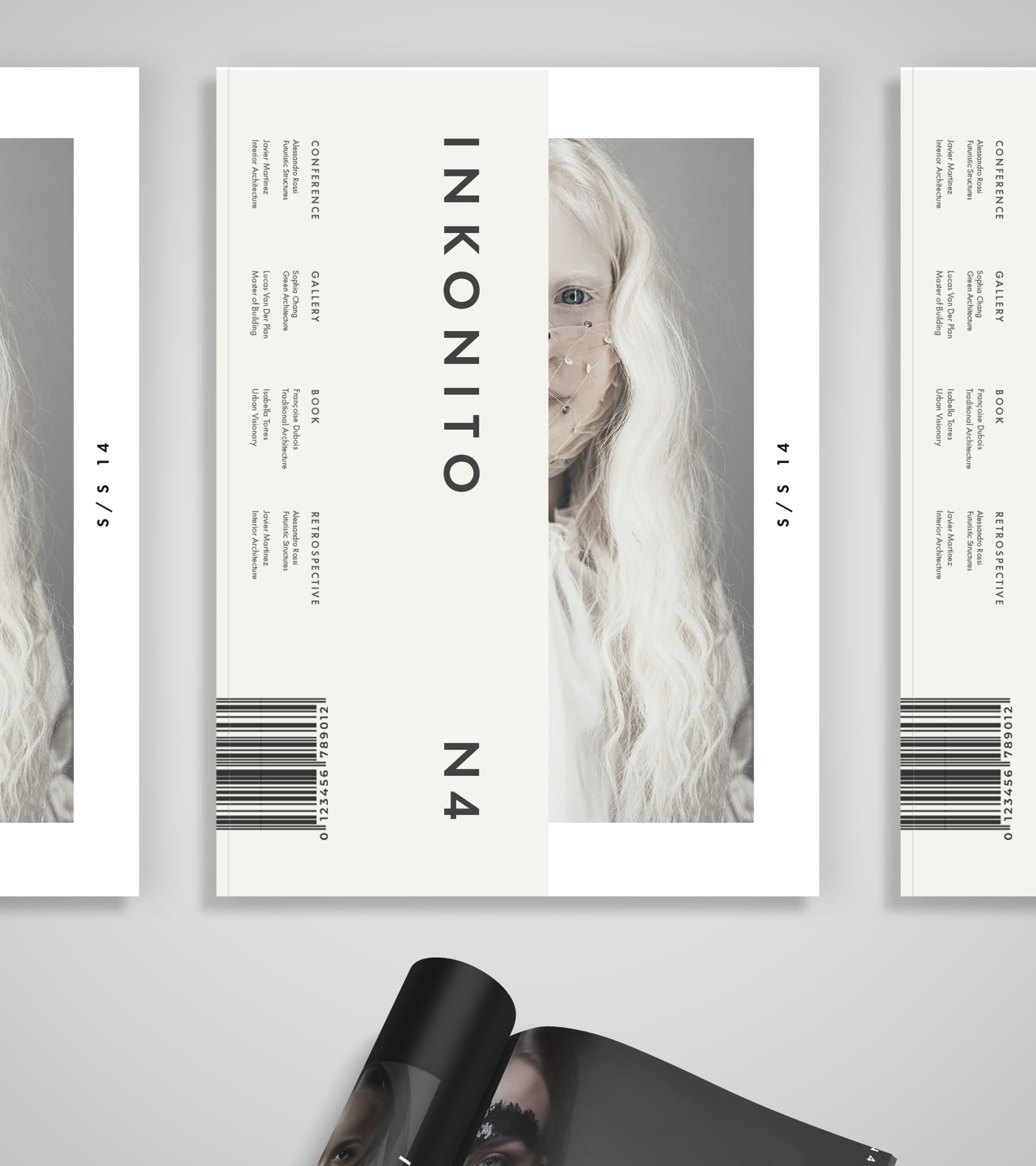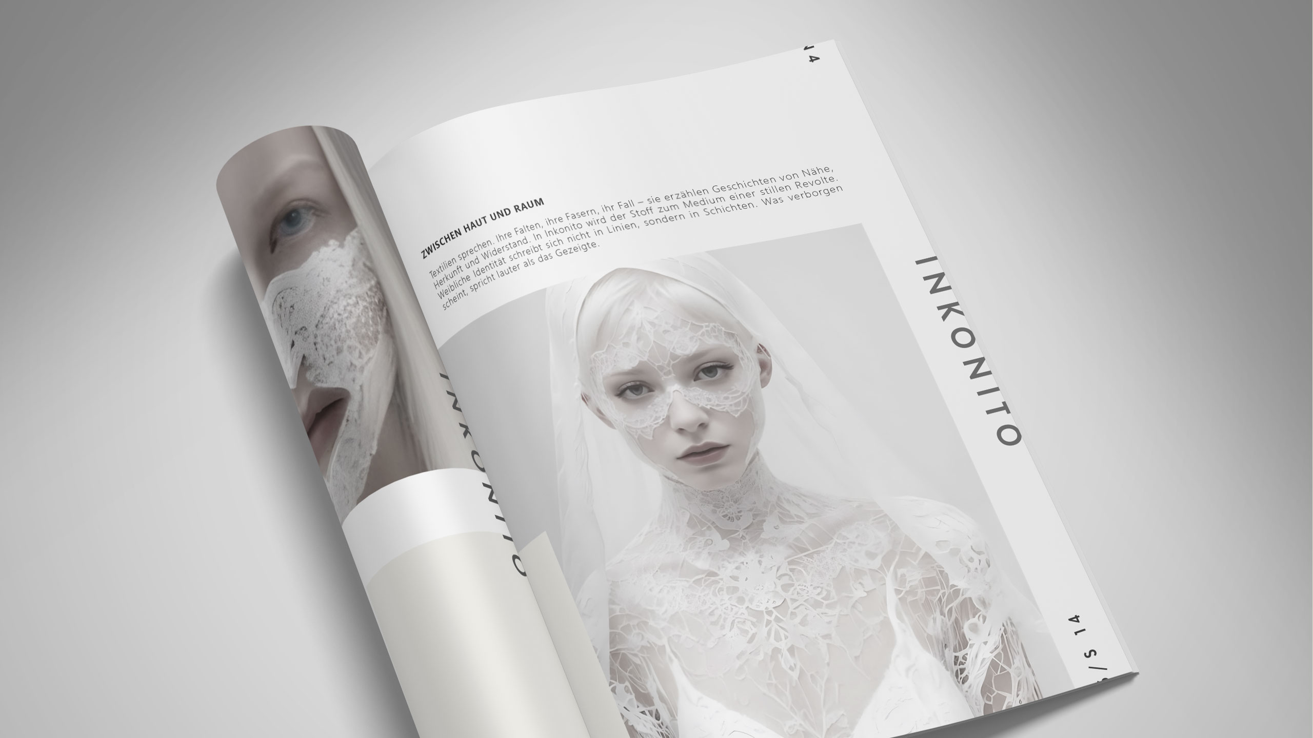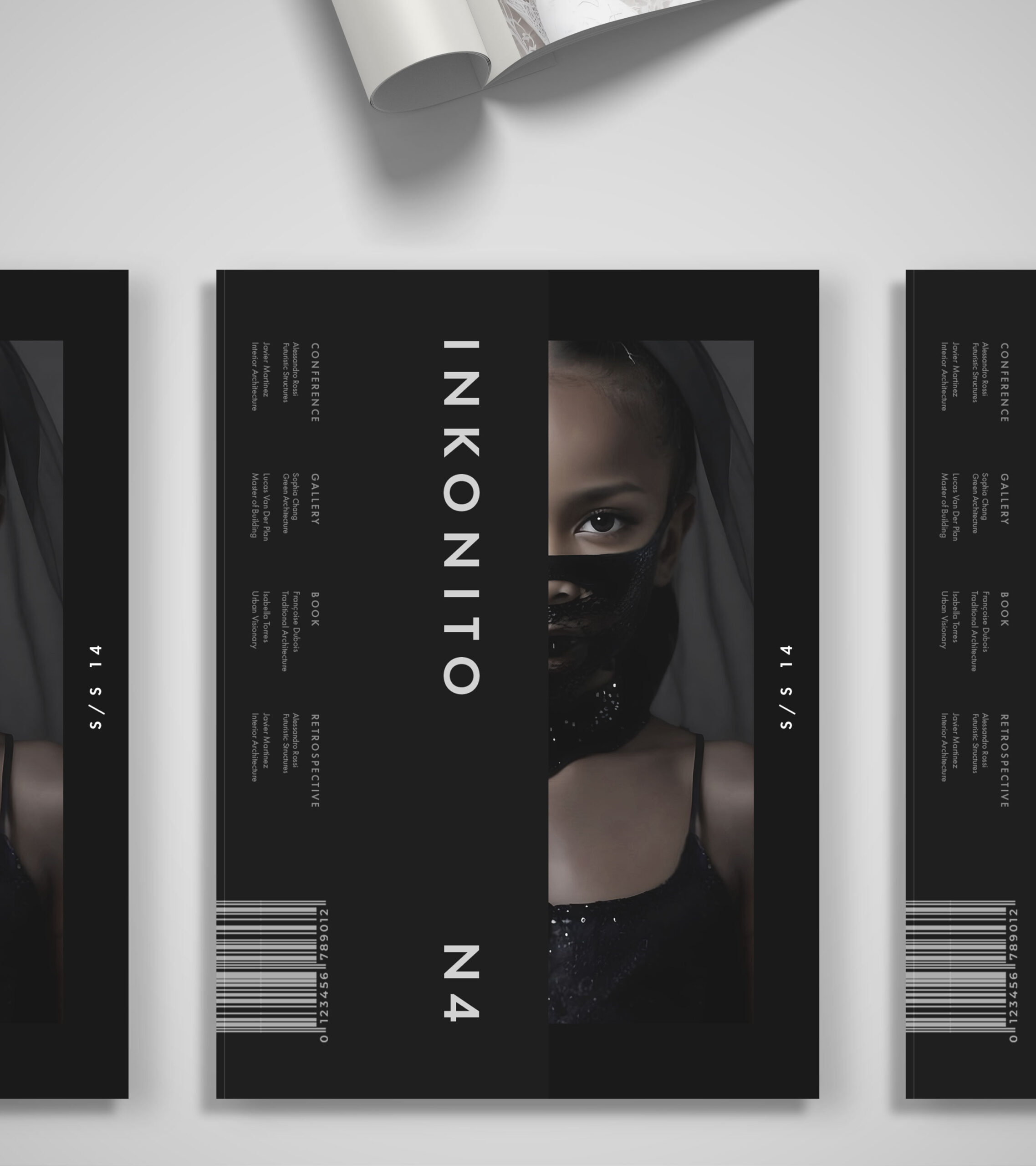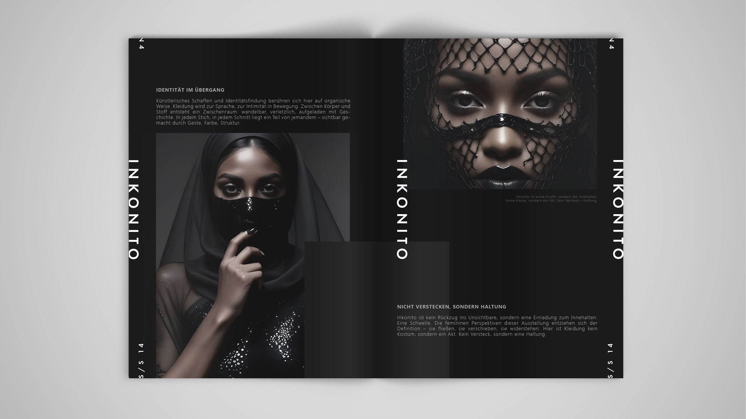 INKONITO is a conceptual brochure exploring identity through restraint, contrast, and visual subtlety. Alternating black and white layouts, it plays on the tension between presence and discretion — a quiet affirmation of self. Faces are masked, half-revealed, or distant, expressing a form of modest visibility. Fashion becomes a language of veiled identity, elegant and reserved. Insert pages — like layers of fabric or whispered secrets — take part in a visual game of masks, concealing only to better reveal. Minimal typography and structured design reinforce this controlled aesthetic. INKONITO is a visual essay on chosen anonymity as a powerful and discreet self-expression.