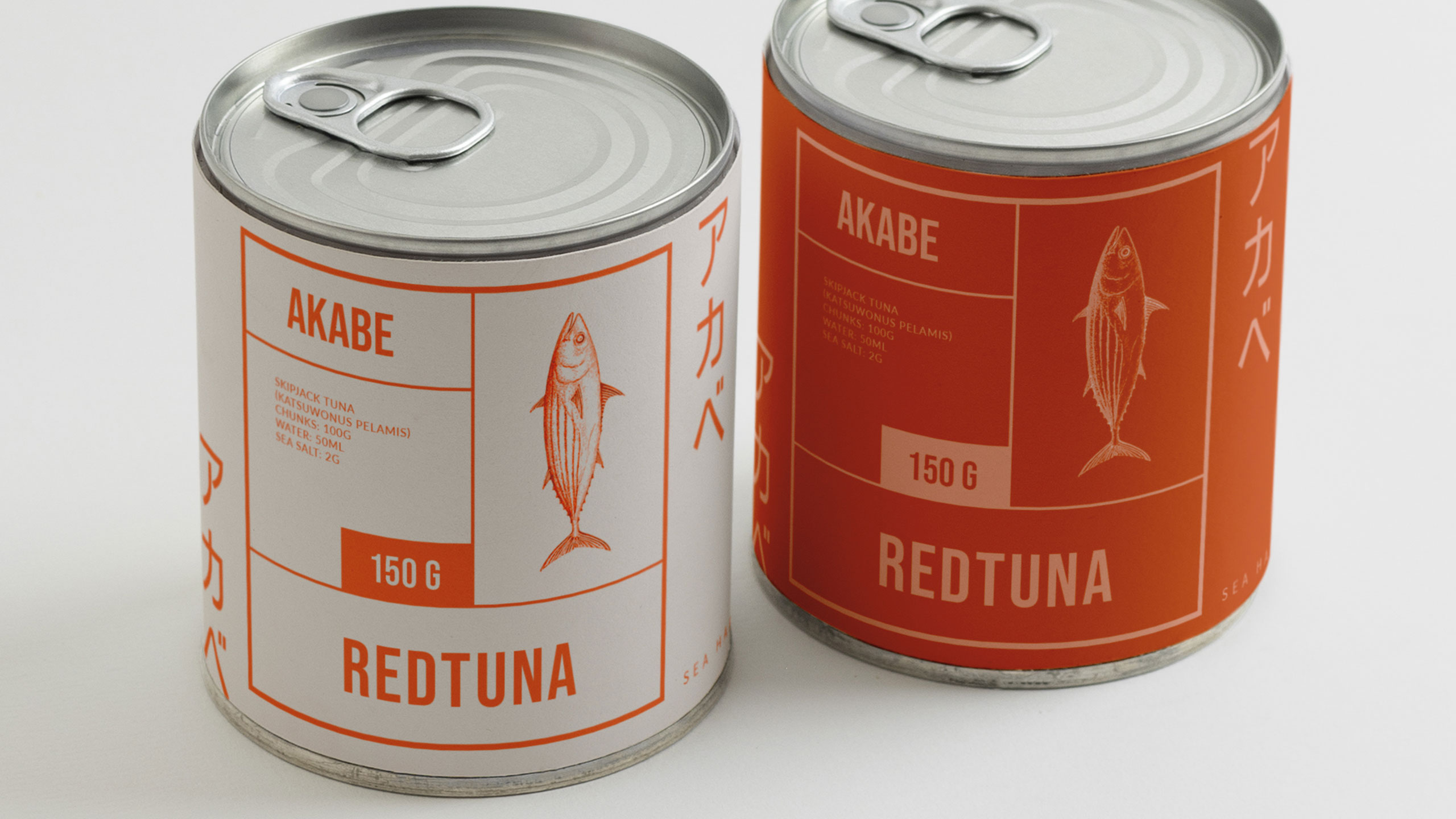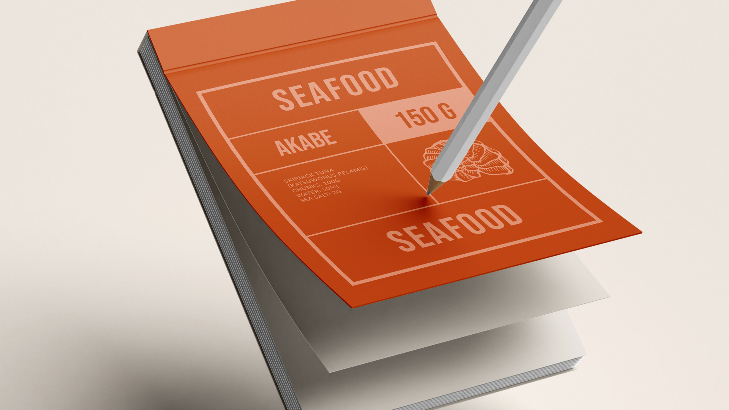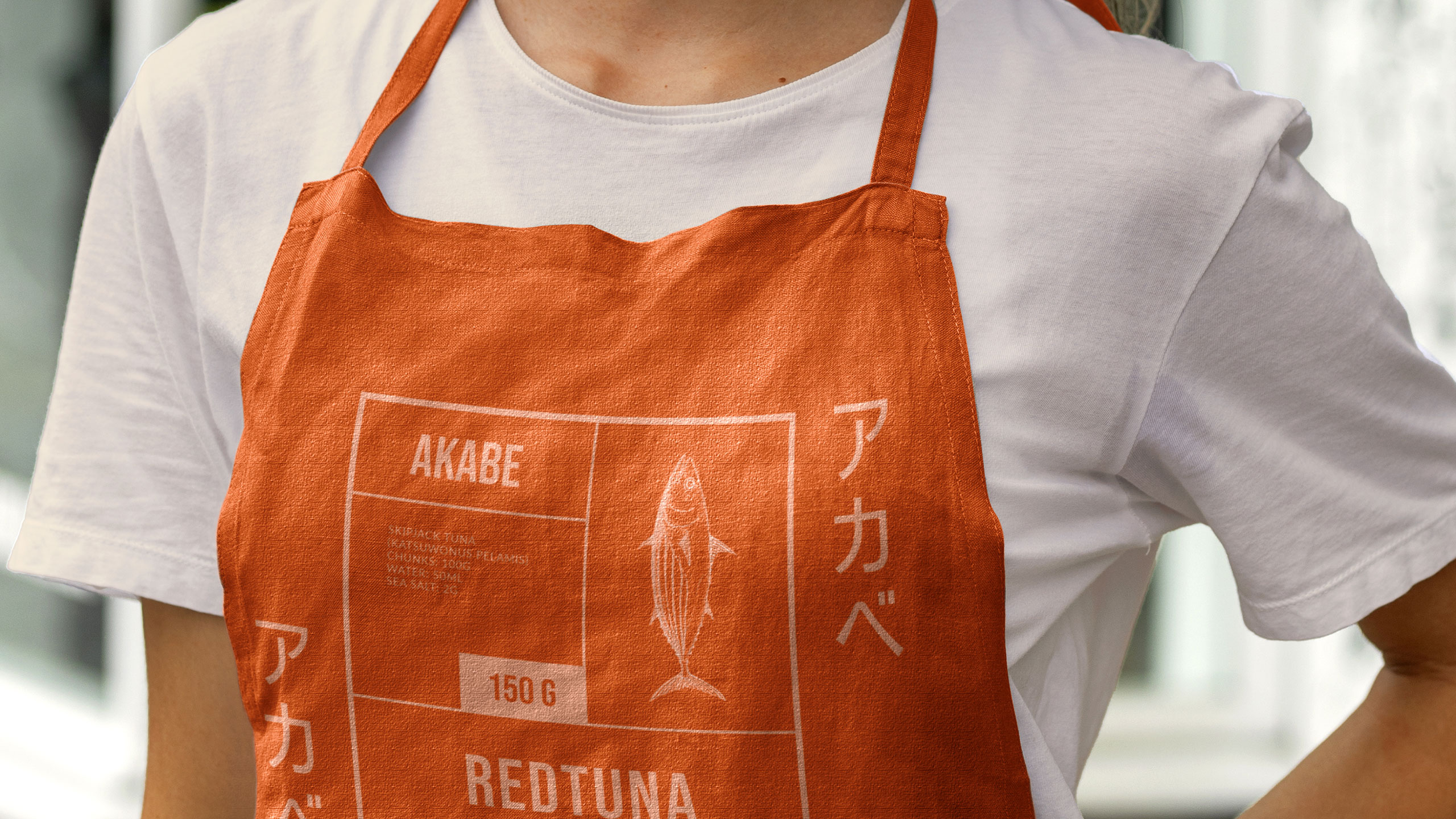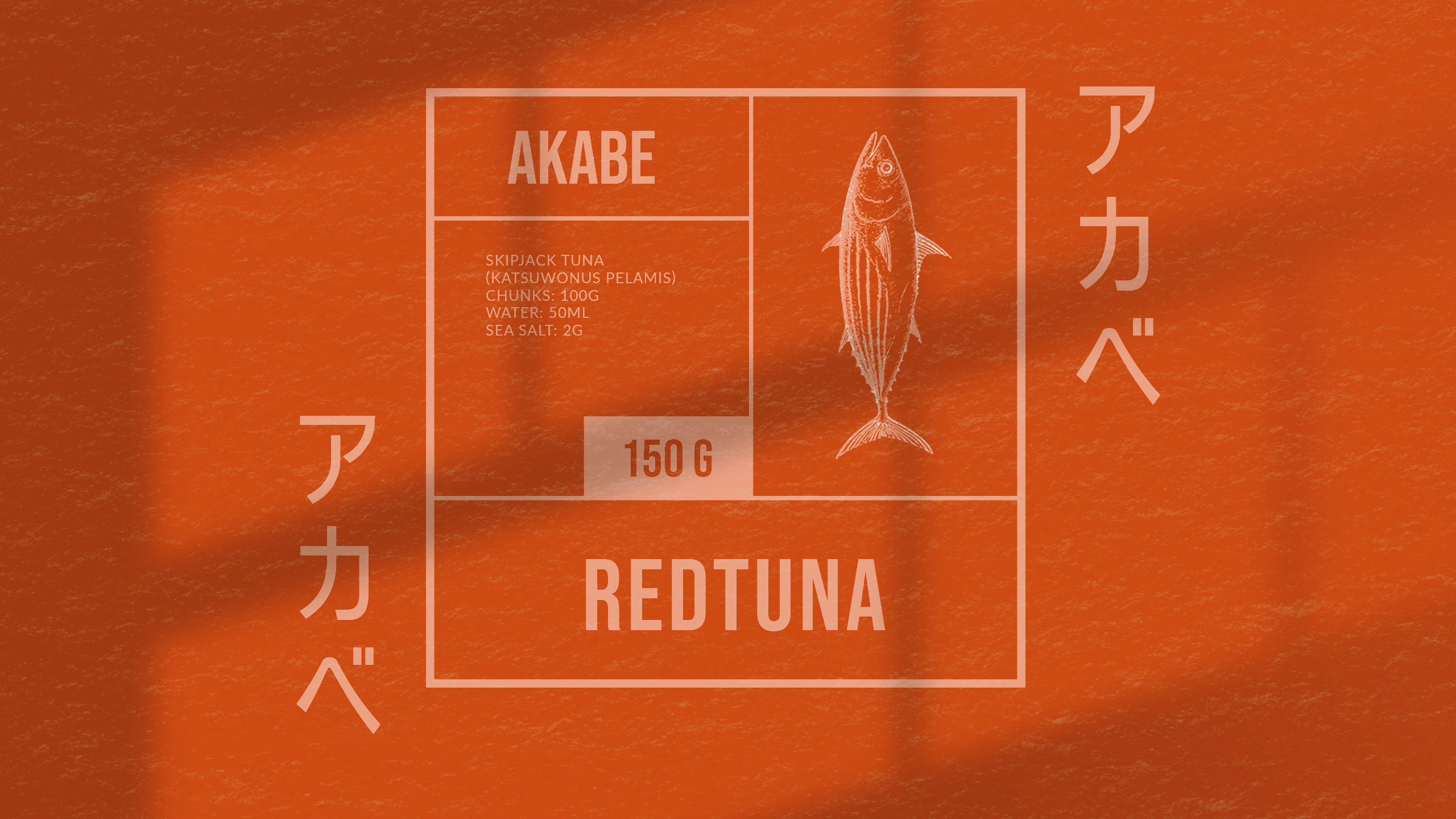 The graphic design for Akabe, a premium seafood cannery, blends modern Japanese minimalism with artisanal precision. Inspired by both maritime heritage and the sound of its name—a nod to Captain Ahab—the brand uses salmon and coral hues, breaking away from traditional sea blues. The packaging and visuals, applied to cans, notebooks, signage, bags, and aprons, feature clean lines and a rational layout. Information is delivered in neat compartments, like labels in a bento box. The result is refined yet functional, evoking both craftsmanship and discipline. Akabe tells a story of the sea through elegant design, structured simplicity, and bold color choice.