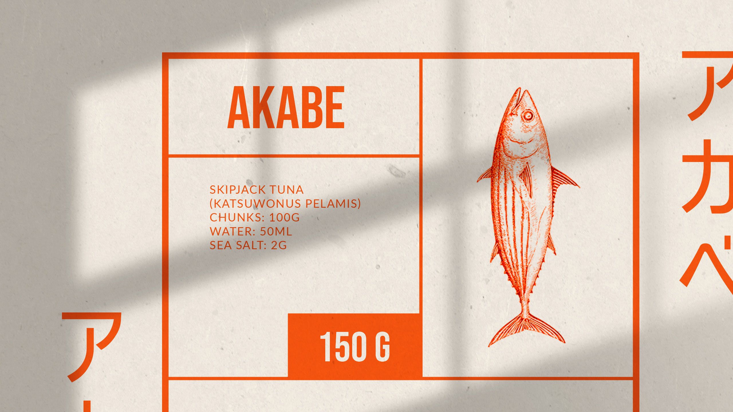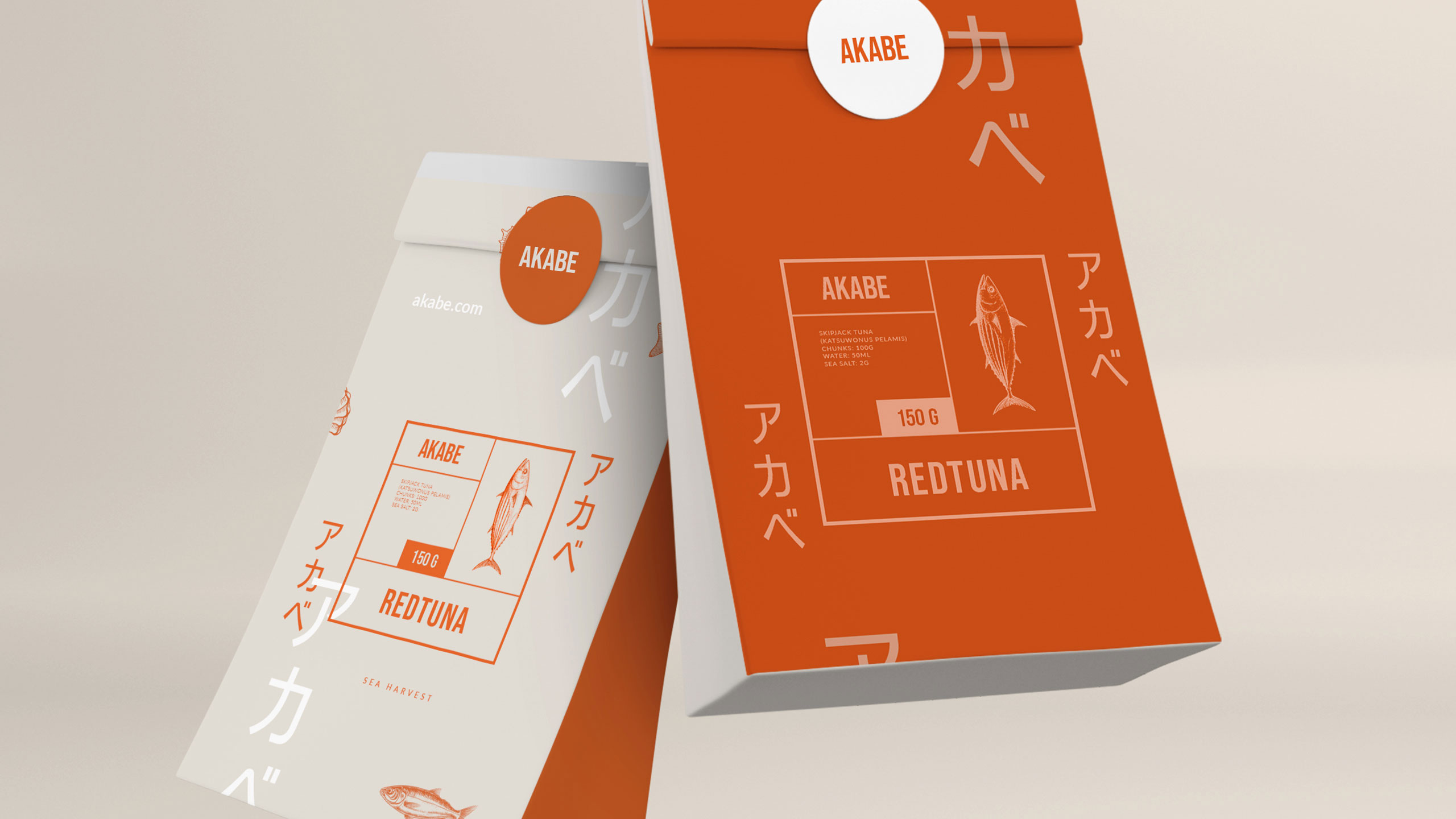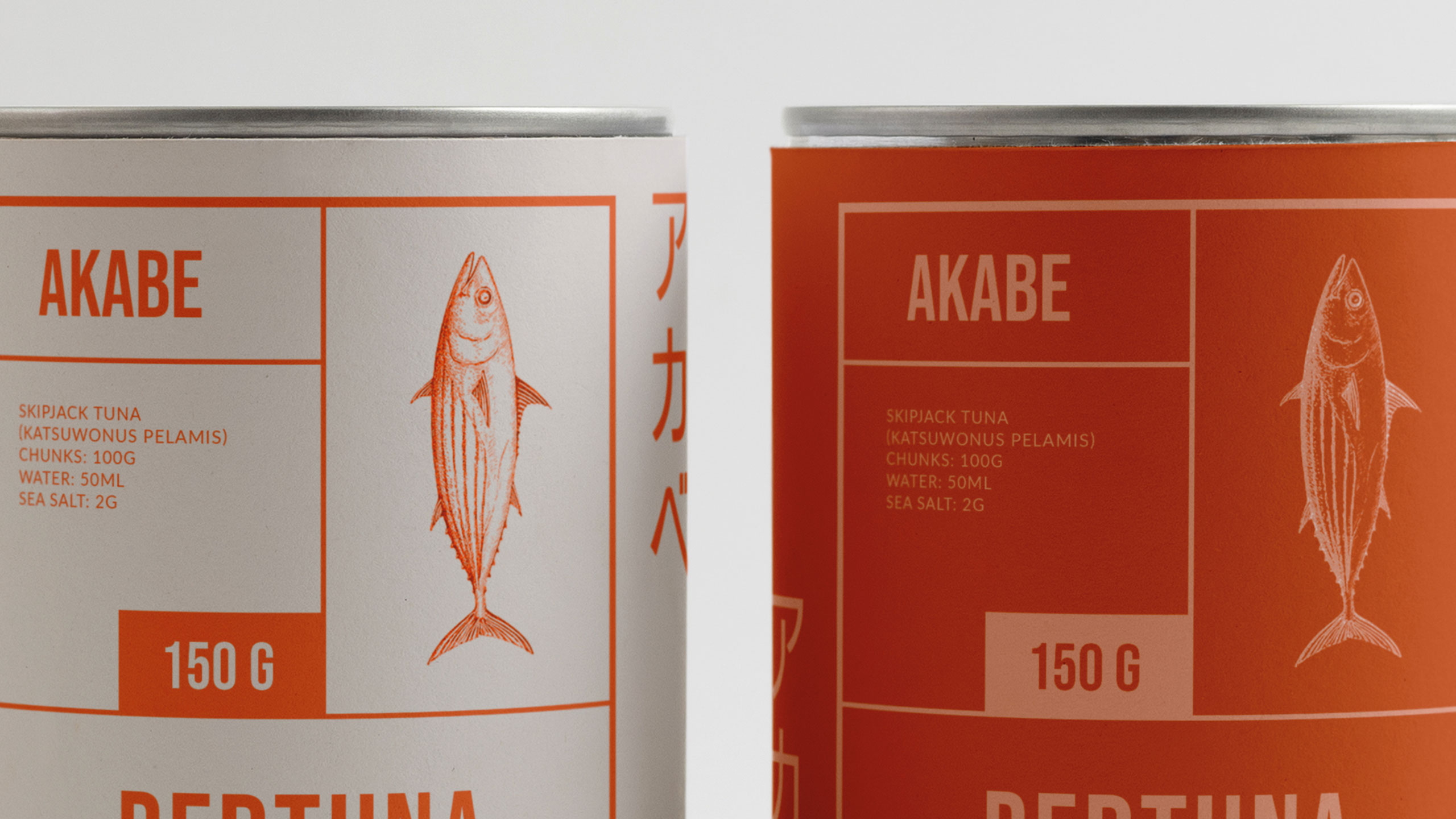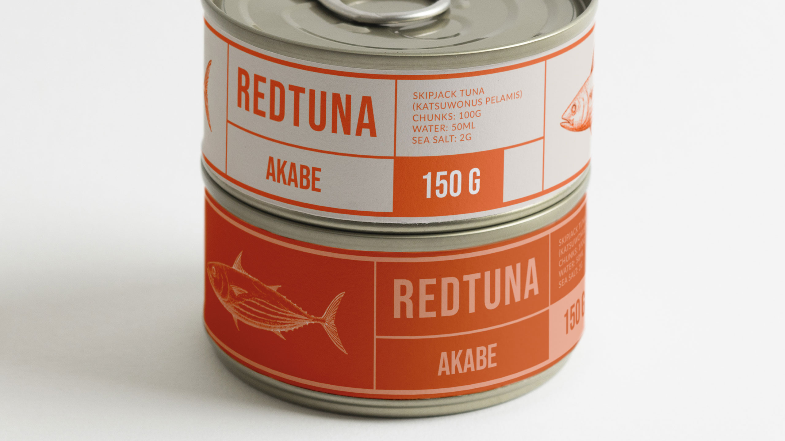The graphic design for Akabe, a premium seafood cannery, blends modern Japanese minimalism with artisanal precision. Inspired by both maritime heritage and the sound of its name—a nod to Captain Ahab—the brand uses salmon and coral hues, breaking away from traditional sea blues. The packaging and visuals, applied to cans, notebooks, signage, bags, and aprons, feature clean lines and a rational layout. Information is delivered in neat compartments, like labels in a bento box. The result is refined yet functional, evoking both craftsmanship and discipline. Akabe tells a story of the sea through elegant design, structured simplicity, and bold color choice.