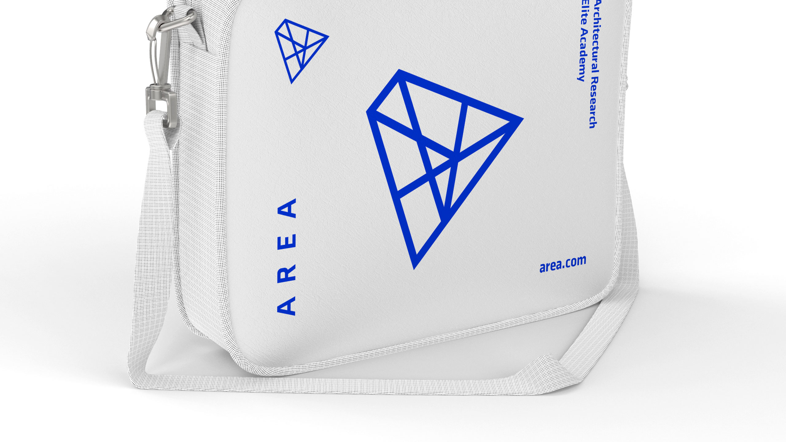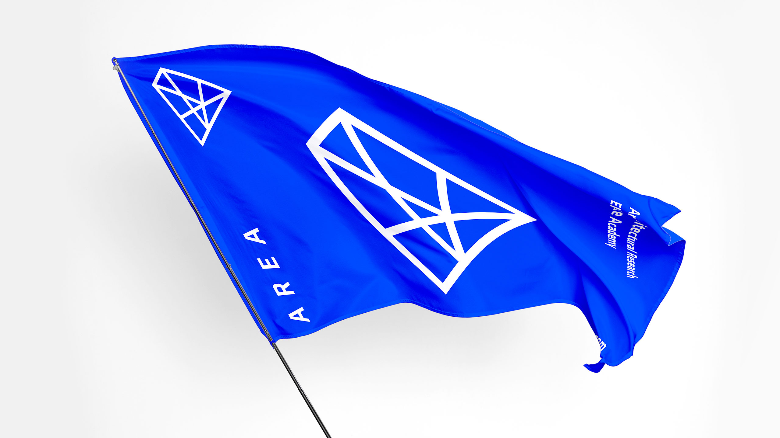 The graphic design for AREA, an architecture school, is modern, minimalist, and sleek, with a dominant color palette of blue and white. The logo, designed as an extruded “A” structure suspended in space, symbolizes architectural innovation. It subtly references pyramids, tying the school’s design philosophy to timeless architectural wonders. The logo’s structure also represents a network of interconnections, a core strength of the school, emphasizing collaboration and the integration of ideas. This clean, contemporary design is applied across various communication materials, including posters, t-shirts, bags, mugs, books, websites, and flags, creating a cohesive and impactful visual identity.
