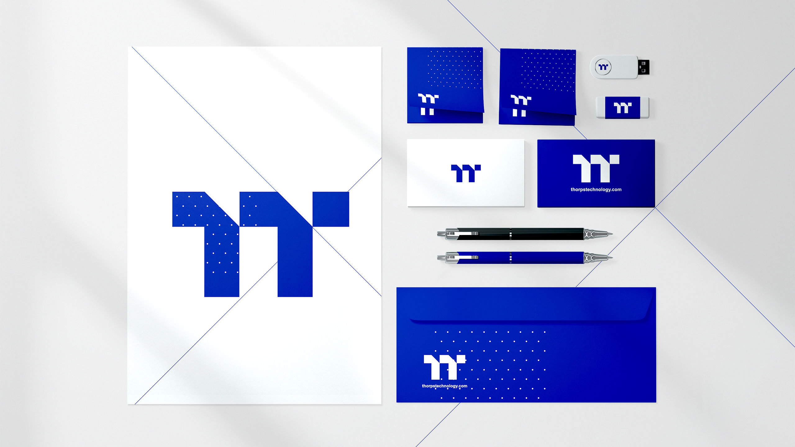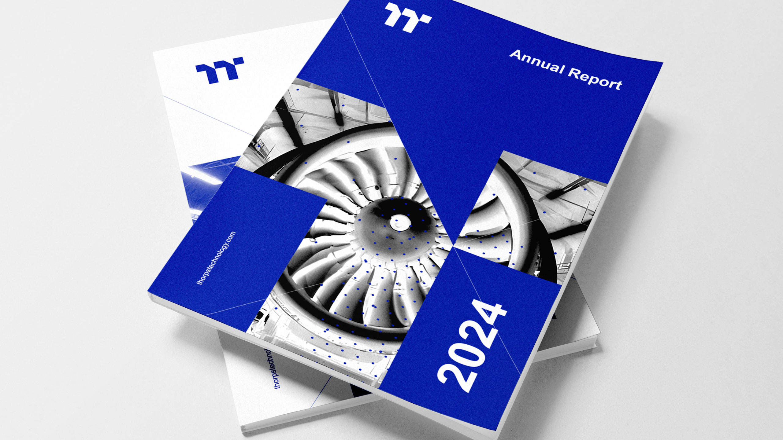 The graphic design for Thorps Technology, an aviation engine manufacturer, adopts a clean, corporate style. Dominated by blue, it evokes both sky and advanced technology. The logo is structured around a double “T” (Thorps Technology), abstractly resembling the profile of a turbine blade or propeller, reinforcing the brand’s aeronautical identity. The visual identity is applied across various supports—T-shirts, mugs, annual reports, caps, ID badges, and stationery—with consistency and technical precision. The design communicates innovation, reliability, and engineering excellence. It positions the brand as a serious, high-tech player in the aerospace sector, while maintaining clarity and visual strength in all formats.