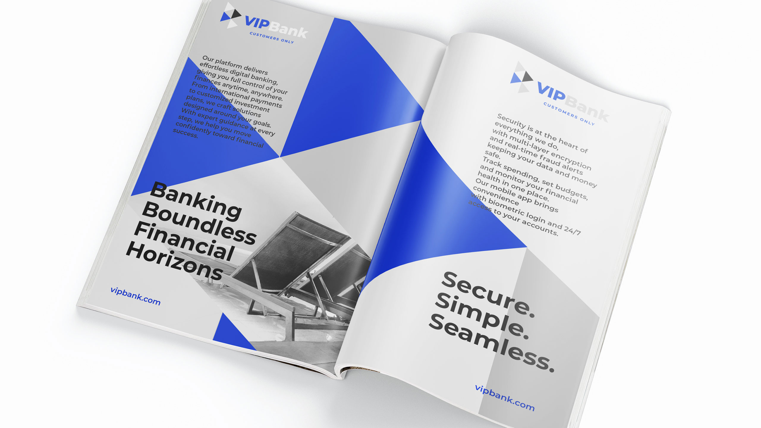How can graphic design embody trust and ambition for a travel-focused bank? VIP Bank uses a sleek palette and dynamic triangles to symbolize progress, merging financial reliability with the freedom of travel.