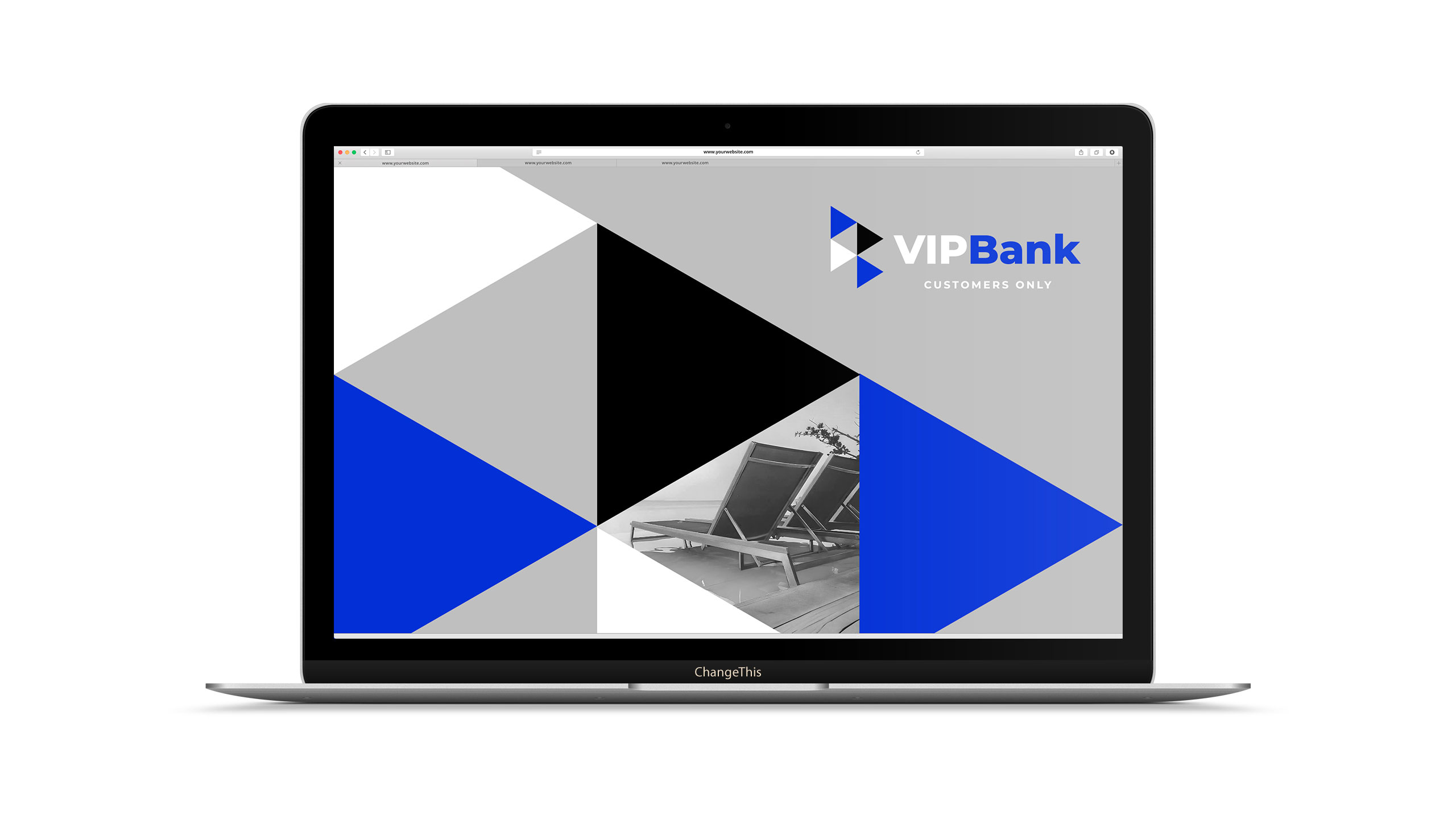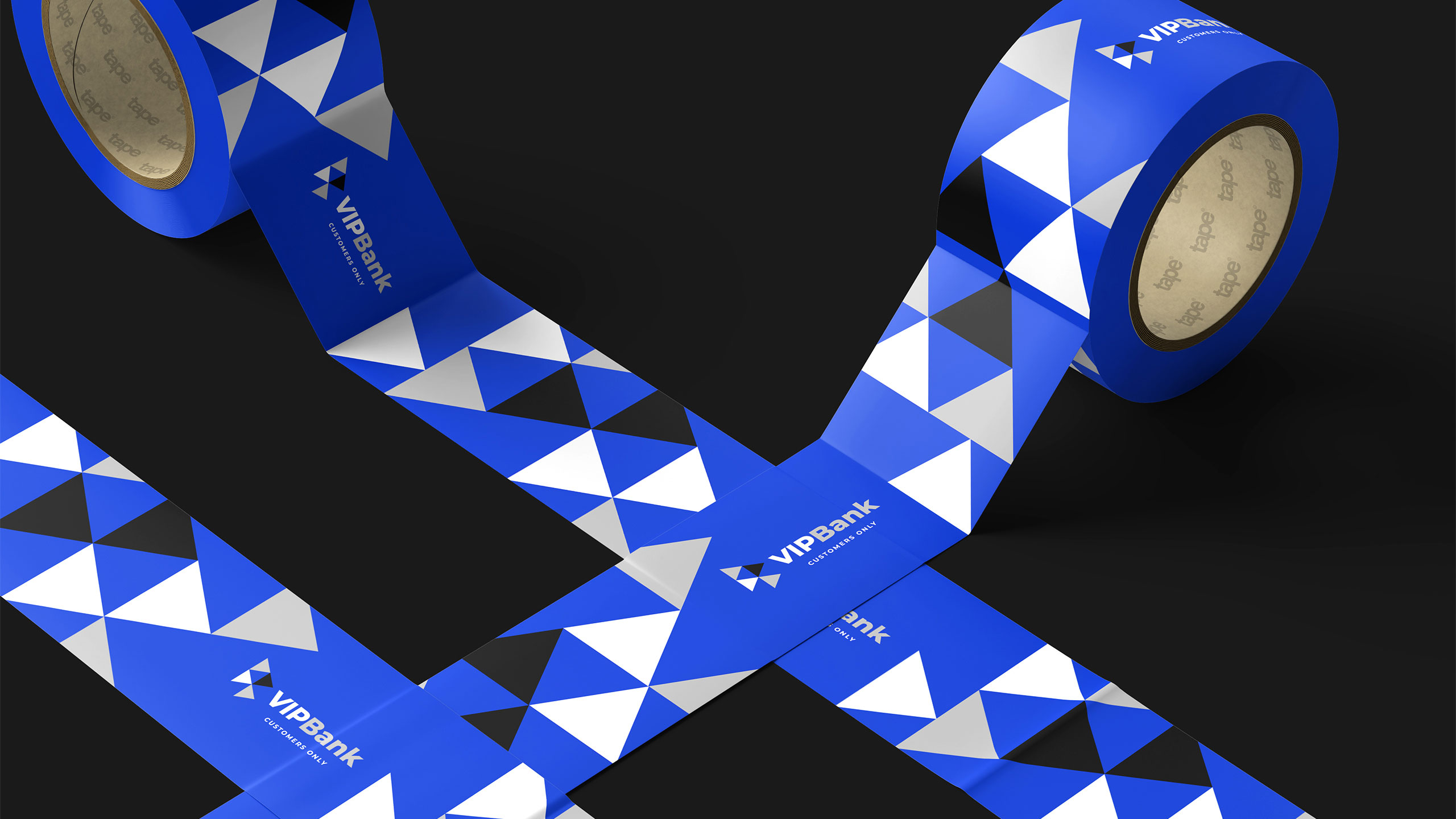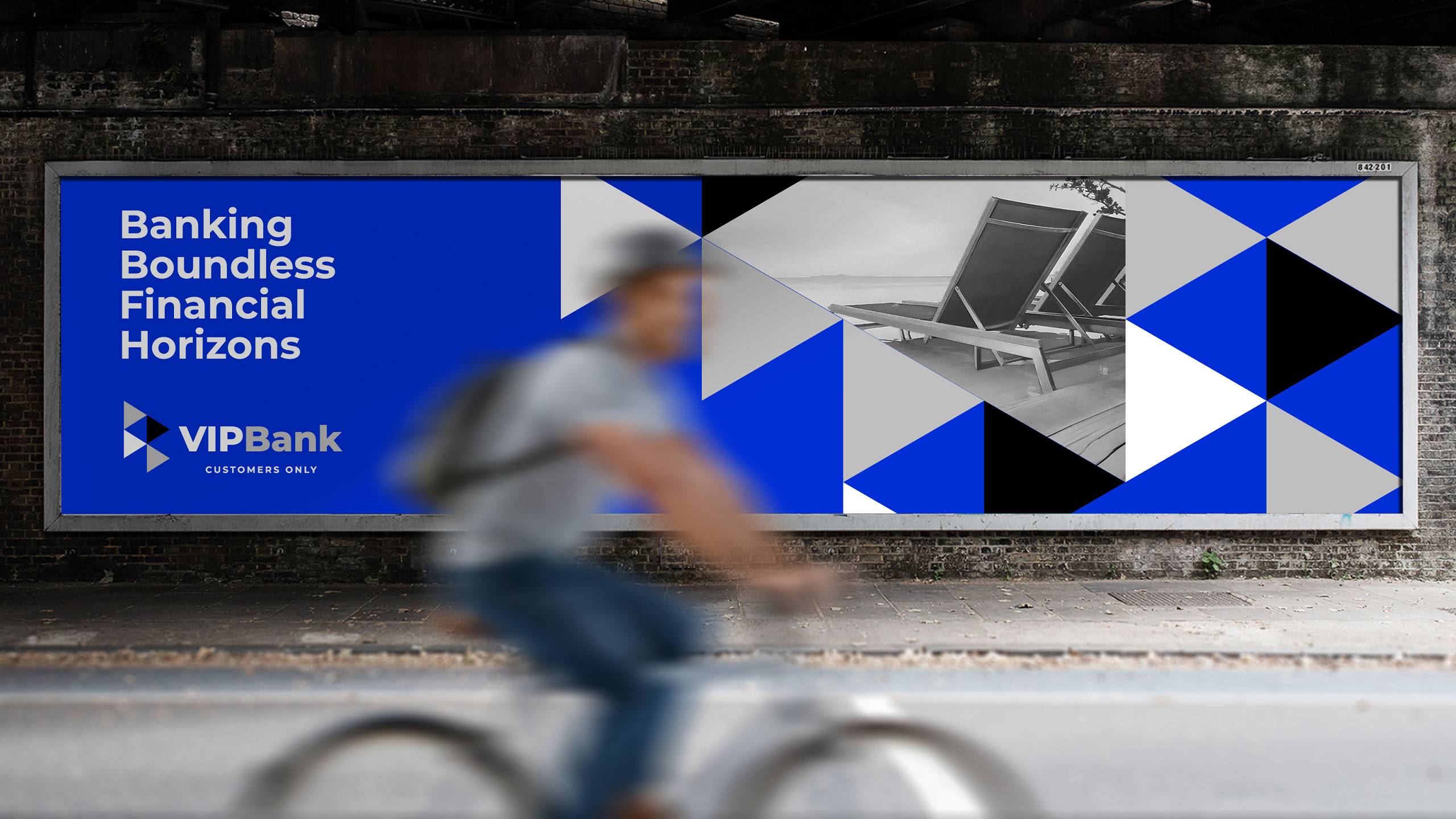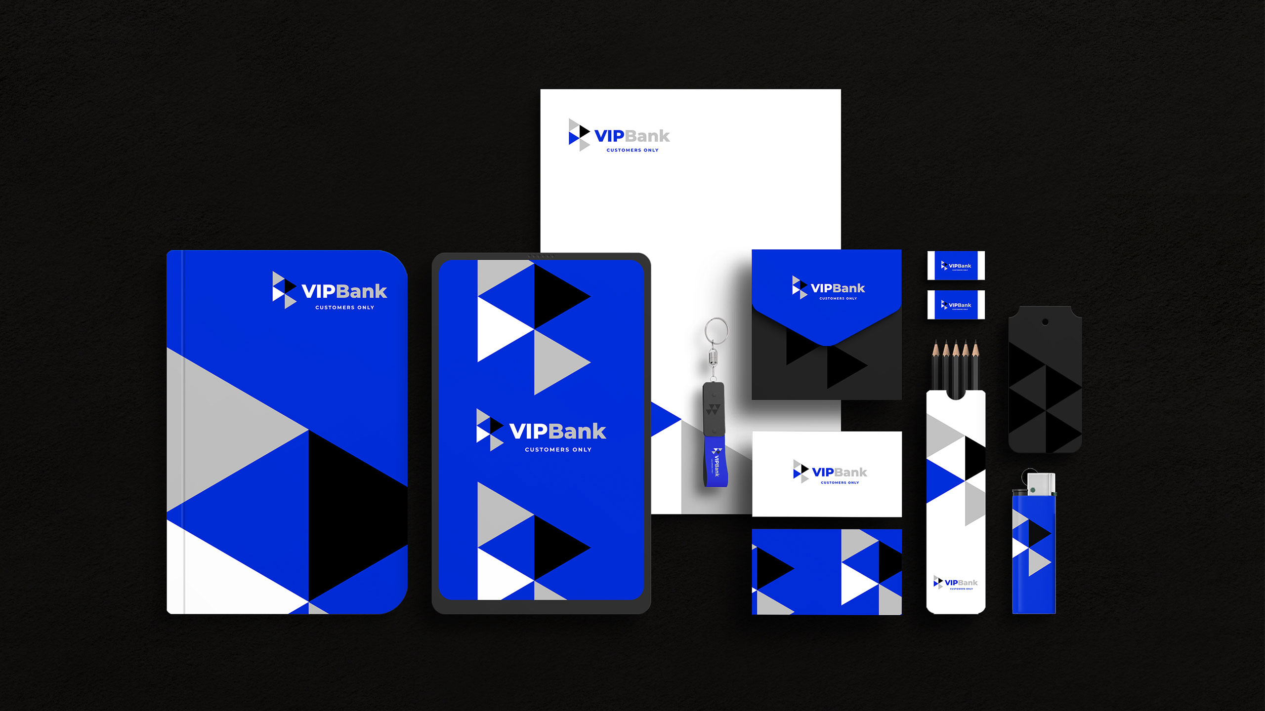 The graphic design for VIP Bank, a banking service tailored for frequent travelers, embraces a sleek, corporate identity with a refined palette of blue, white, grey, and black—“blue for travel.” The branding is deployed across credit cards, stationery, storefronts, posters, ads, and T-shirts. At its core is a dynamic, modular system of triangular shapes, reminiscent of directional arrows or a flag in motion, symbolizing progress and movement. This bold yet professional visual language connects the idea of financial trust with ambition and freedom, encouraging clients to go further—both in their travels and personal projects—with VIP Bank by their side.