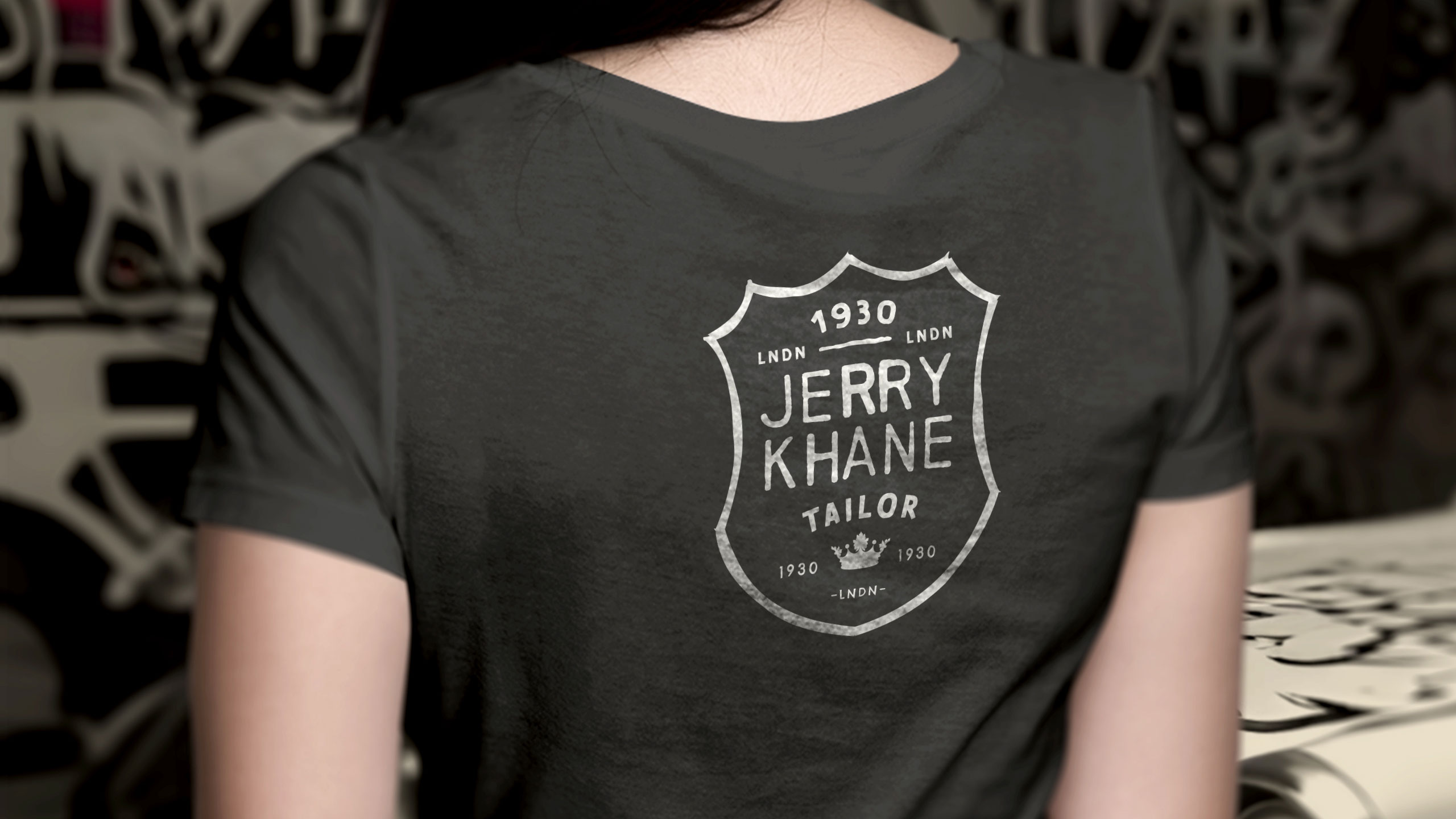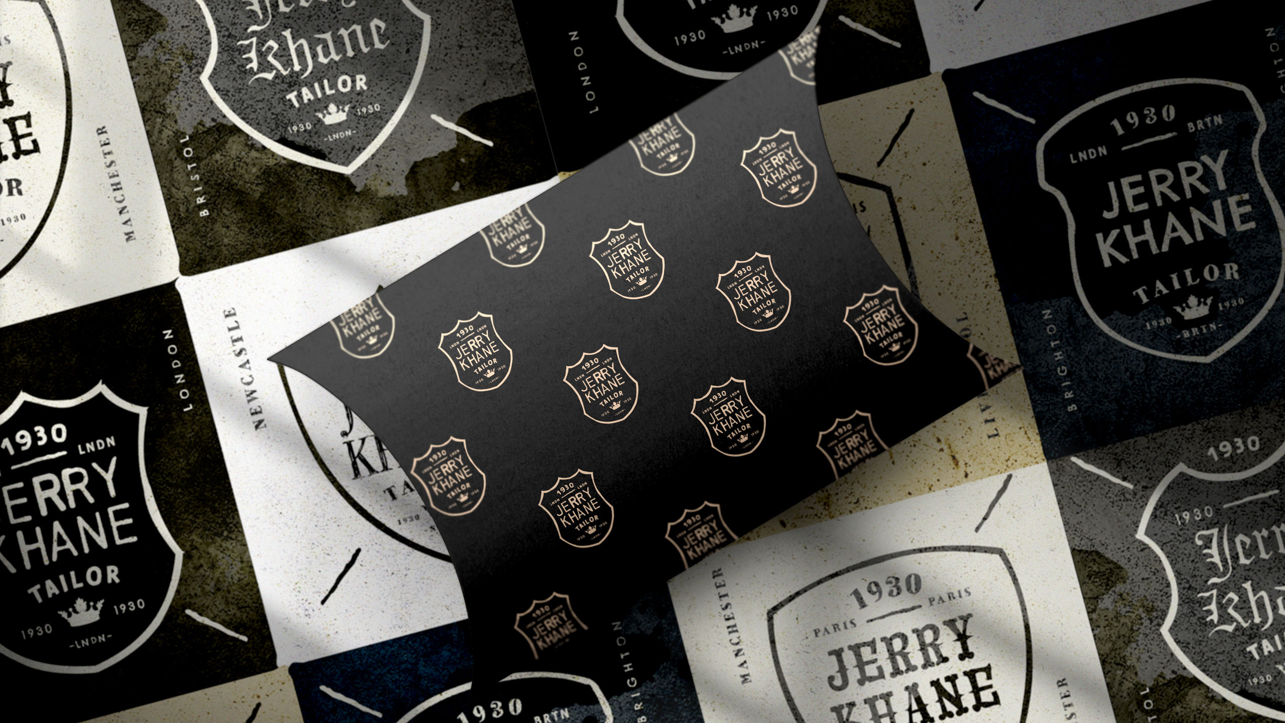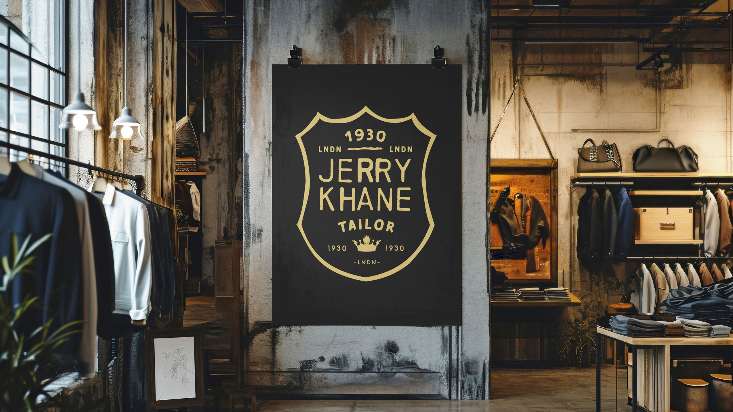 Jerry Khane – Tailor blends vintage elegance with raw authenticity. Using a black and gold color palette, the brand evokes sophistication and discretion. The logo adopts a heraldic crest shape, suggesting aristocratic heritage and exceptional craftsmanship. Yet, hand-drawn lines introduce an artisanal, human touch. Graphic elements carry the texture of oil-stained paper and workshop grit, aligning with the “garage” trend — a nod to custom culture and retro masculinity. Imagery often places models beside classic cars, reinforcing this aesthetic. Even the name, Jerry Khane, cleverly echoes “jerrican,” fusing ruggedness with refinement. A brand where tradition meets tailored rebellion.