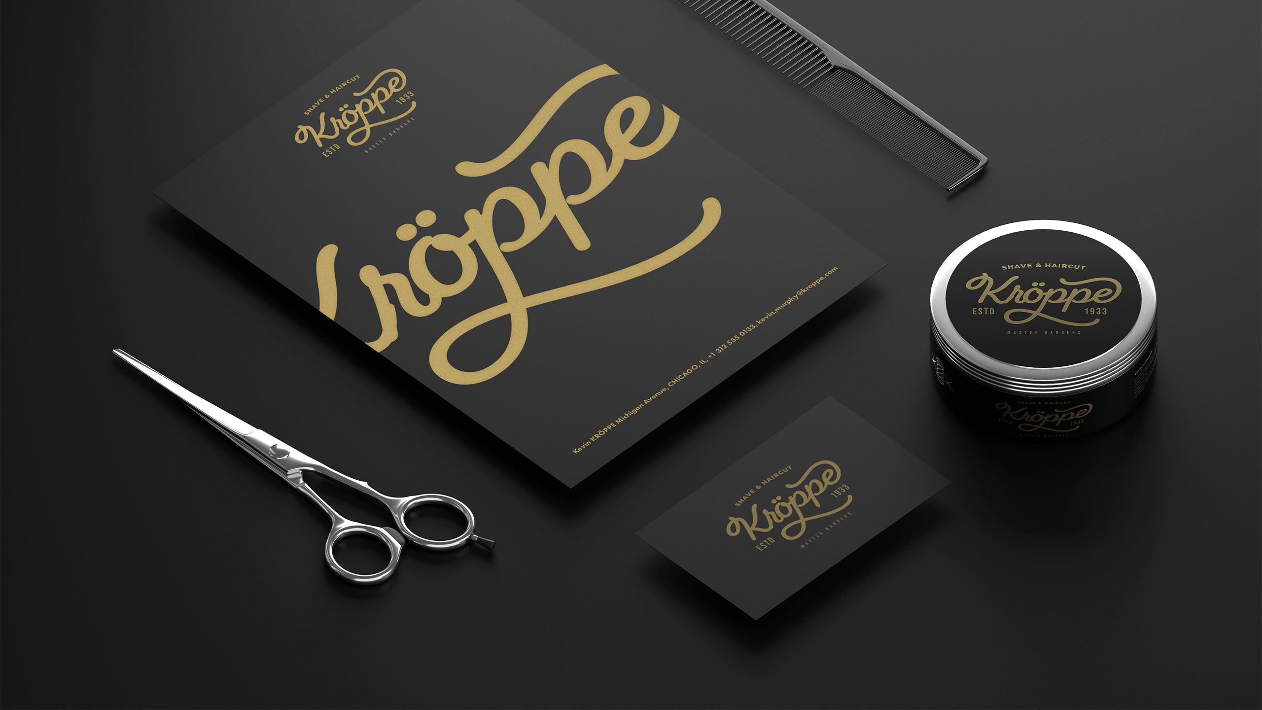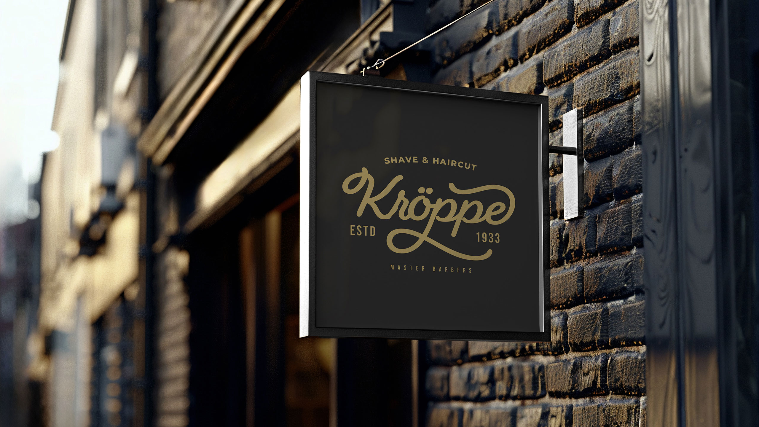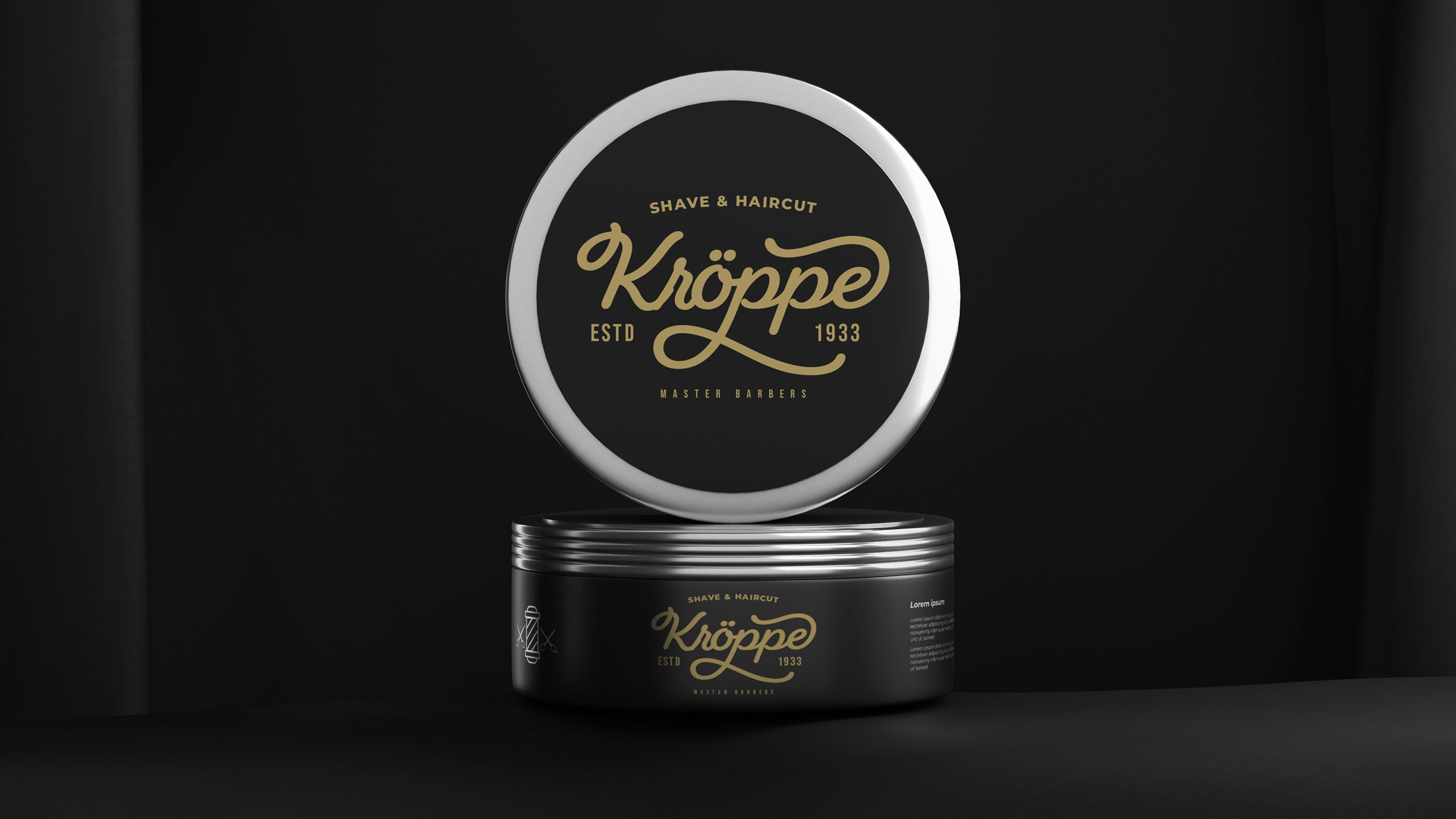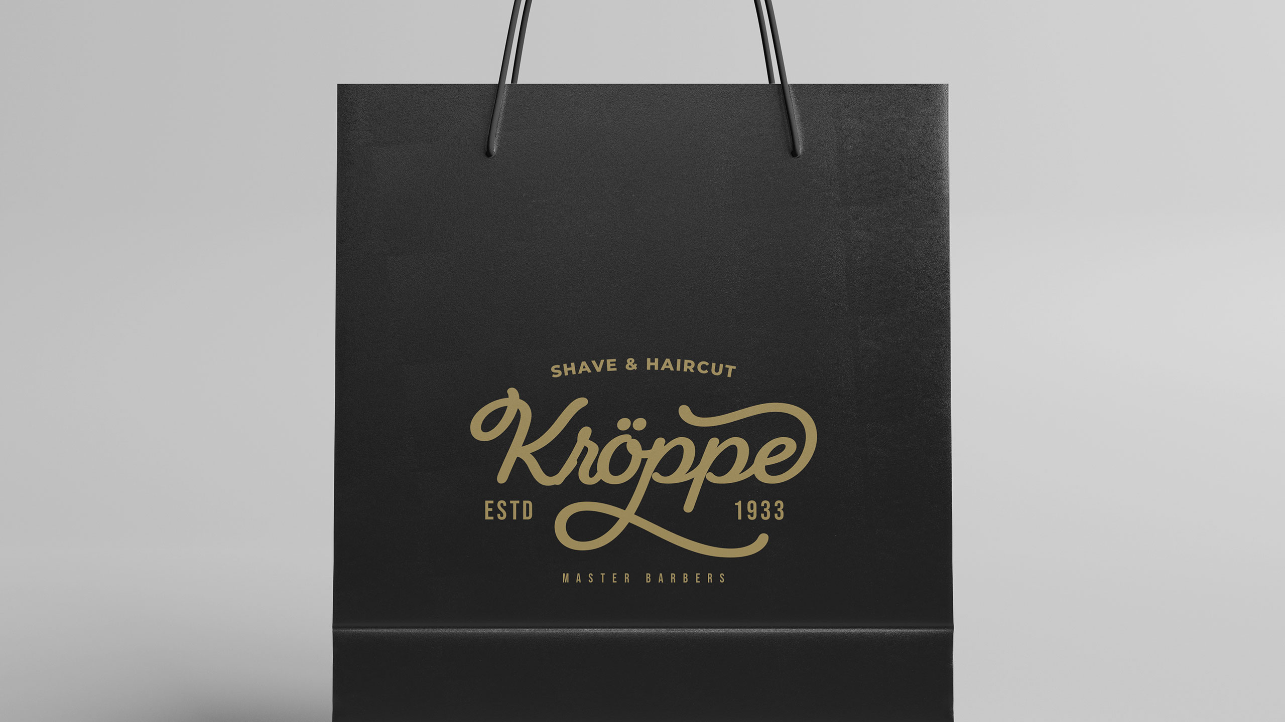 Kroppe’s graphic design channels vintage refinement and masculine elegance. Used across signage, packaging, T-shirts, bags, and stationery, the identity evokes the legacy of an old-world barbershop brand. With a name blending “crop” and Germanic flair, Kroppe positions itself as a historic house of expertise. The black-and-gold palette reinforces a sense of timeless luxury and confidence. A signature-style logo anchors the identity—deliberately unique and slightly ornamental—projecting craftsmanship and tradition. Every element supports the impression of premium, ritualistic care. Kroppe is more than a men’s cosmetic line; it’s a symbol of grooming heritage and dignified.