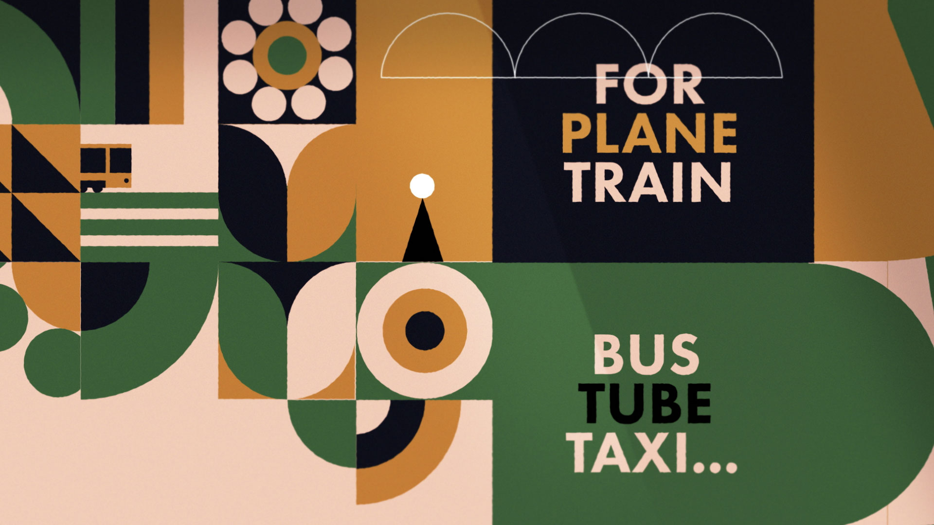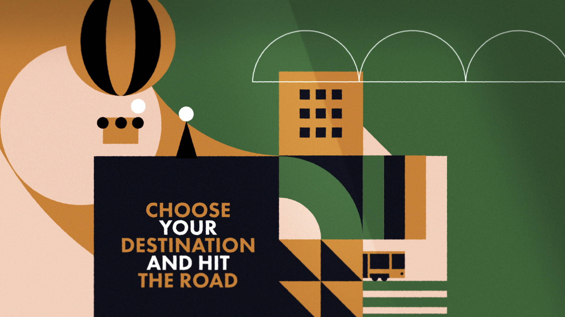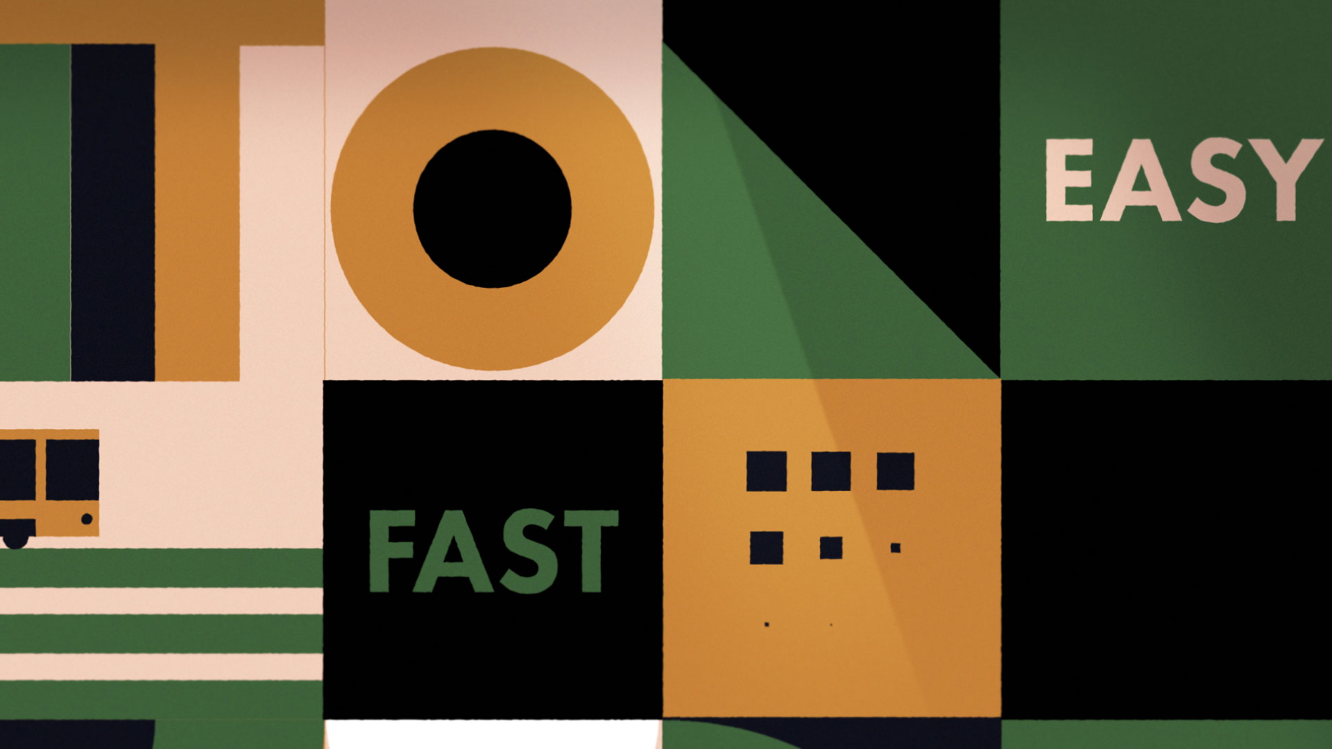 The brand identity for Cityzen, an intercity transport ticket booking app, features a cheerful and playful graphic design applied across multiple media. The name blends “city” and “zen,” reflecting stress-free urban travel. The dominant colors — green, pale yellow, and soft pink — create a light, welcoming atmosphere. The visual language is built around geometric, childlike illustrations that evoke a sense of carefree adventure, suggesting that using the app makes travel simple and joyful. This whimsical tone is reinforced in promotional videos through the use of music with playful, childlike tones, further emphasizing ease, positivity, and the pleasant experience of moving between cities.