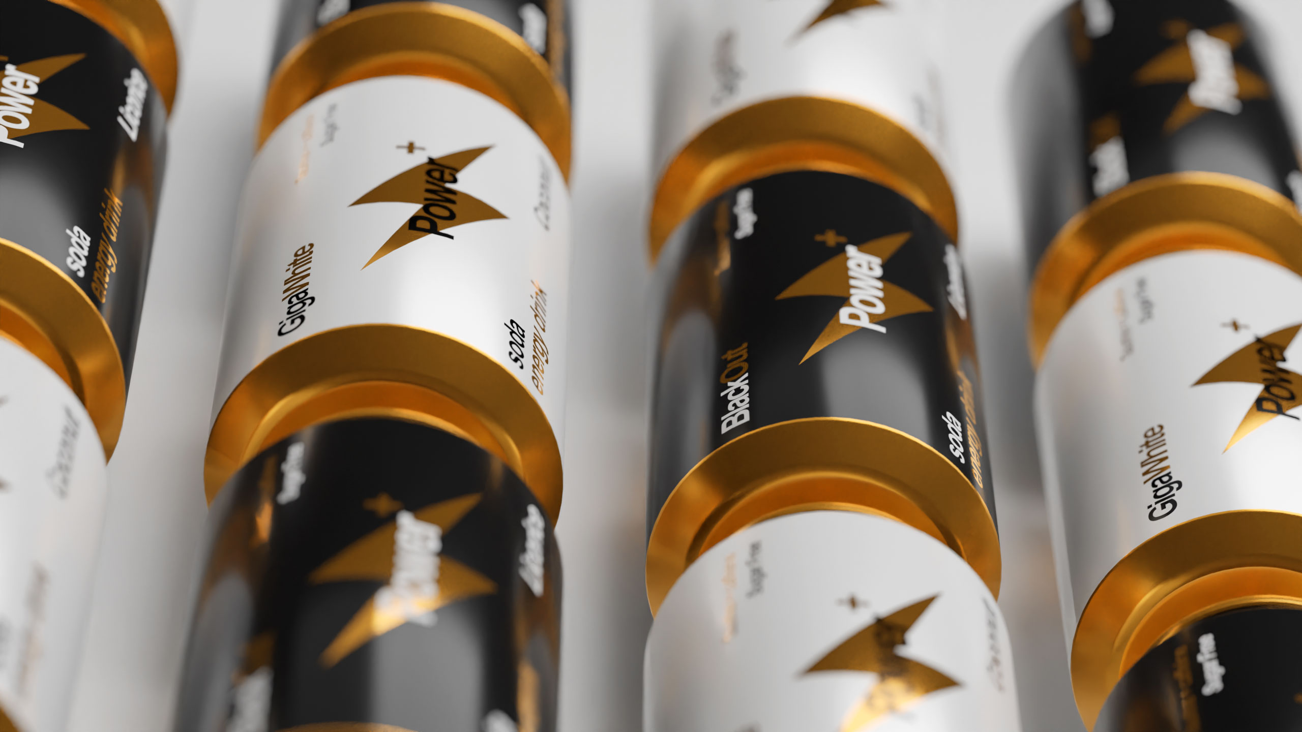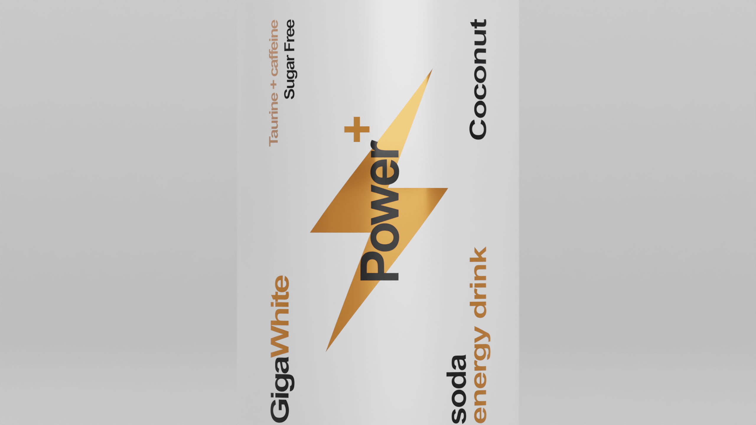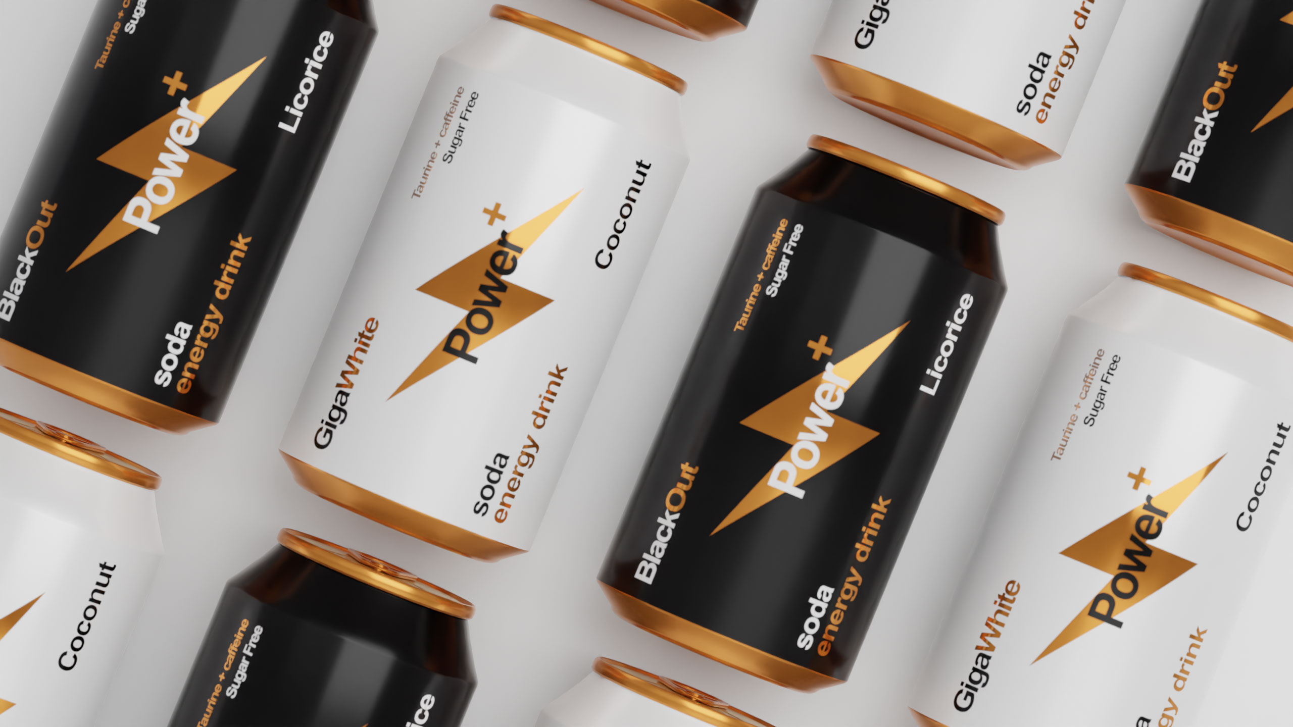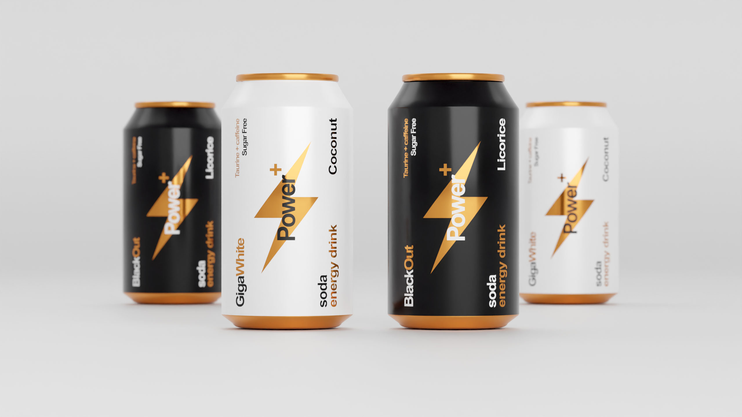 The 33cl aluminum can for “Power+” energy drink features a simple, informative Swiss-style graphic design, emphasizing clarity and precision. The can is designed to resemble a battery, symbolizing energy and power. The dominant colors—black and white—vary depending on the flavor, while gold accents provide a premium touch, reminiscent of high-quality battery variations. The minimalistic design is sleek and functional, aligning with the brand’s focus on energy and performance. The overall aesthetic conveys a sense of reliability and strength, while the clean, modern look appeals to consumers seeking both efficiency and sophistication in their energy drink.