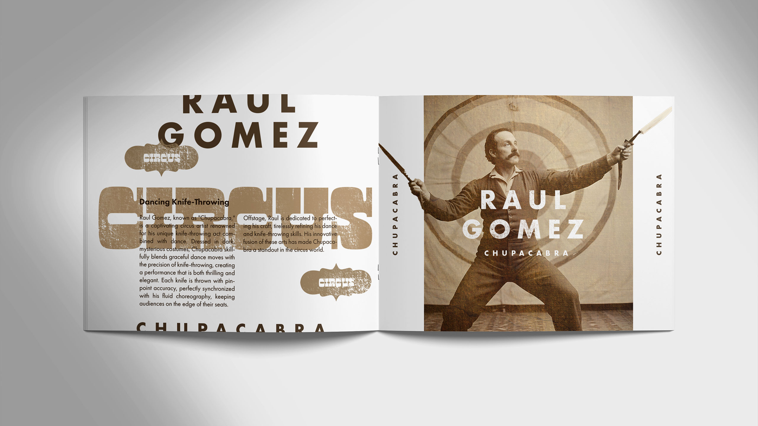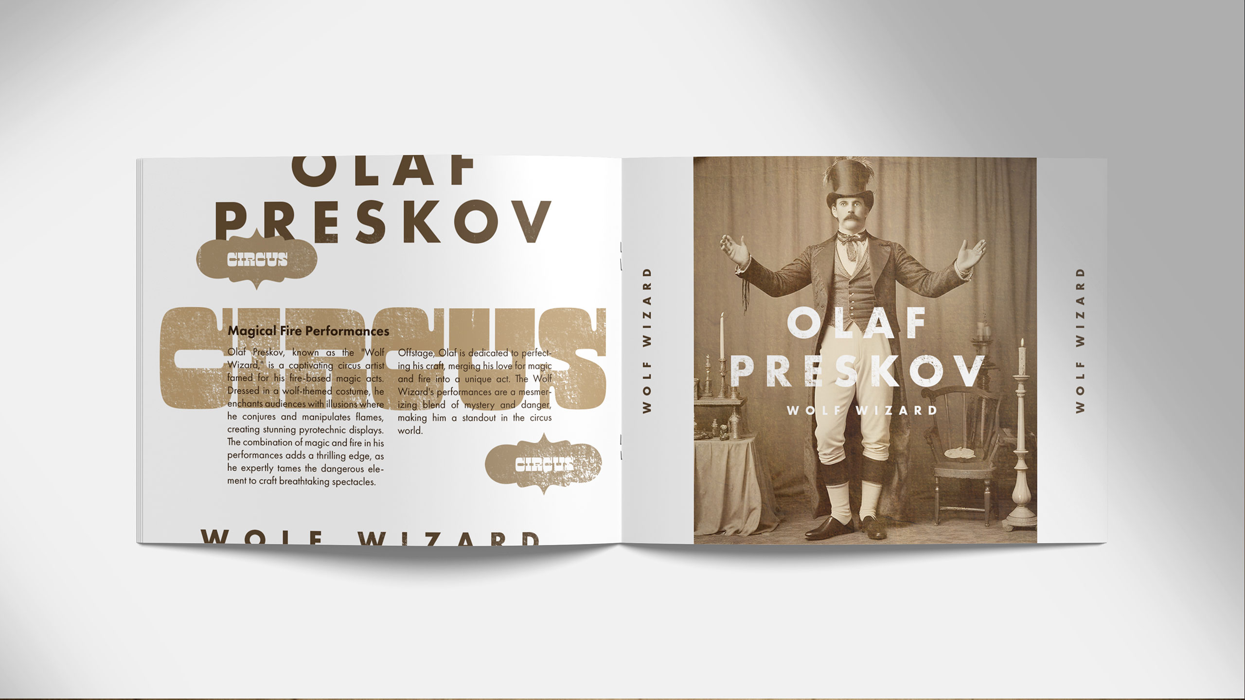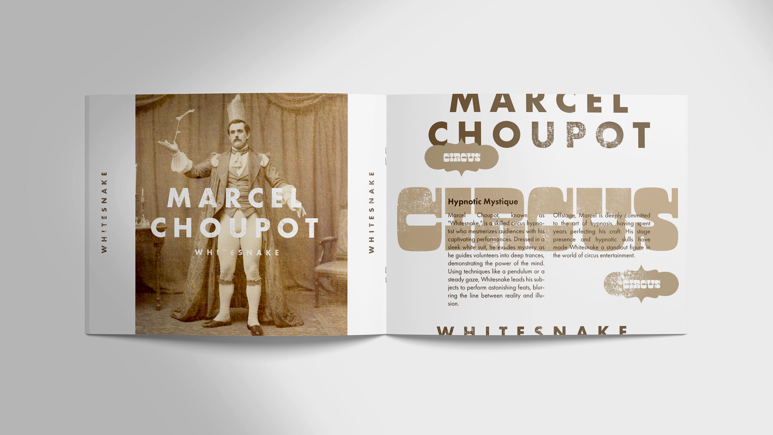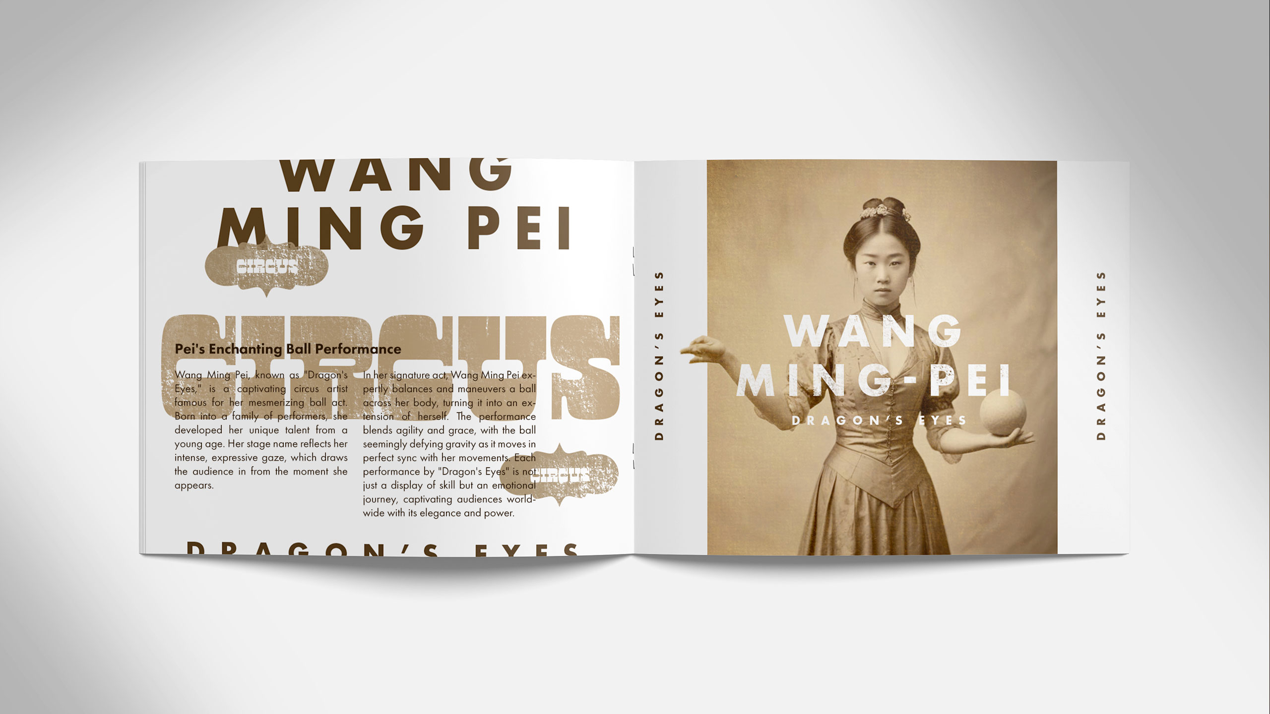 Evoking the charm of old-world spectacle, the visual identity of Circus draws from the vintage aesthetic of 19th- and early 20th-century sideshows. Each spread in the performance program is dedicated to a single artist, capturing their act in sepia-toned photography and stark black-and-white layouts. The style recalls the mysterious allure of historical “freak shows” and surreal, superhuman feats—half real, half myth. The result is a poetic narrative that transforms the program into a collector’s object. This imagined past infuses the modern traveling circus with timeless wonder, inviting audiences into a world where fantasy and performance become inseparable.