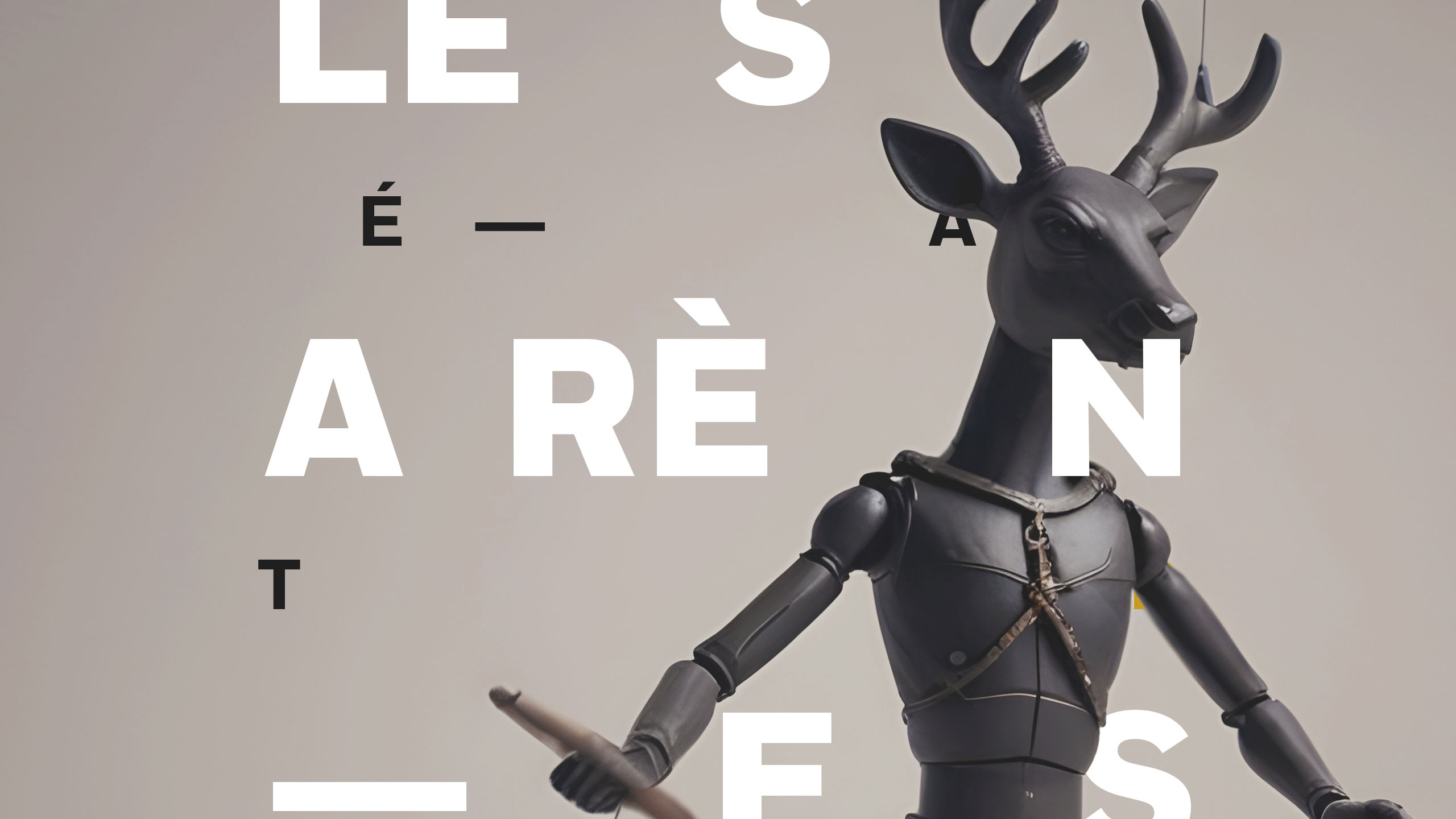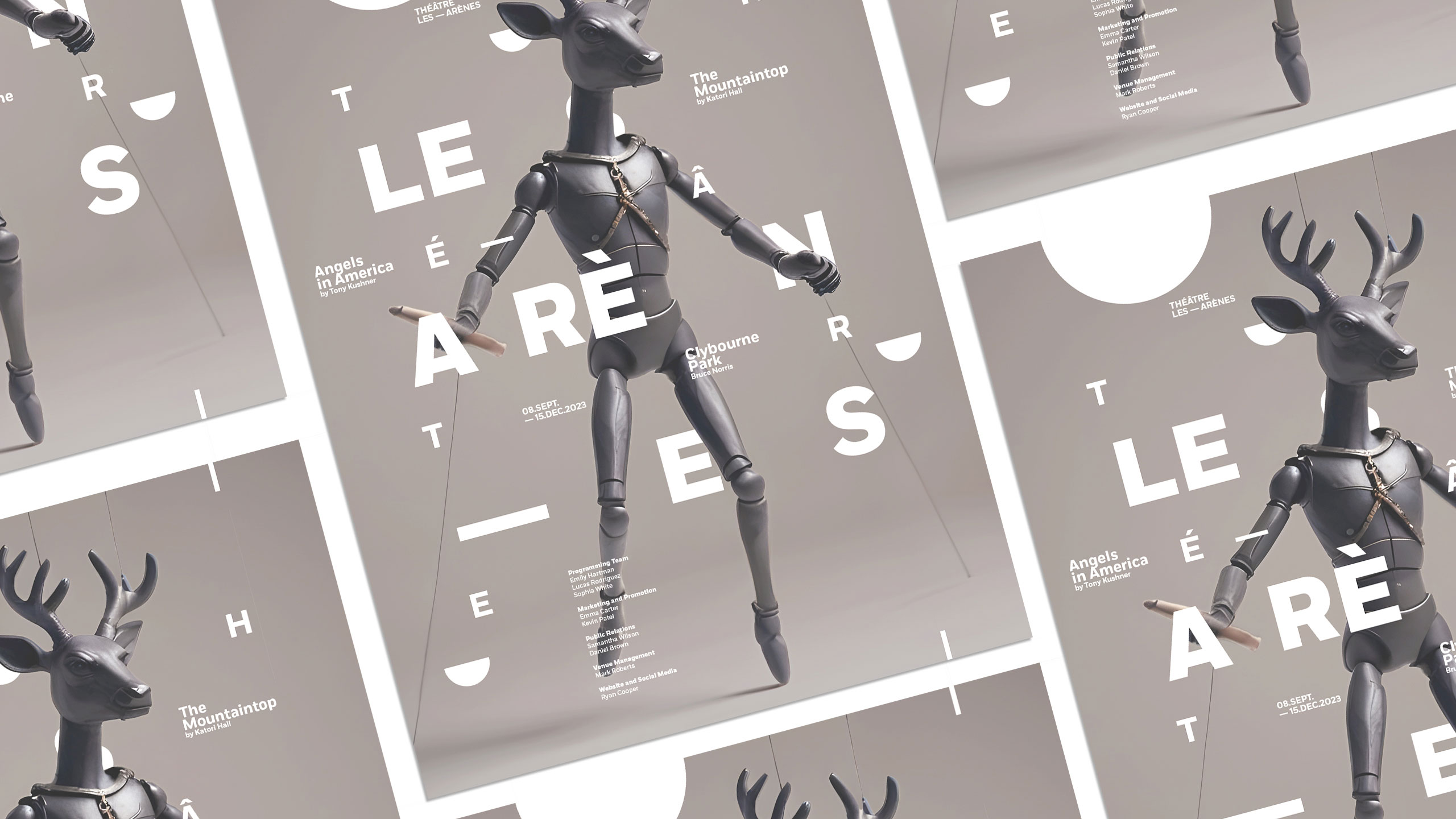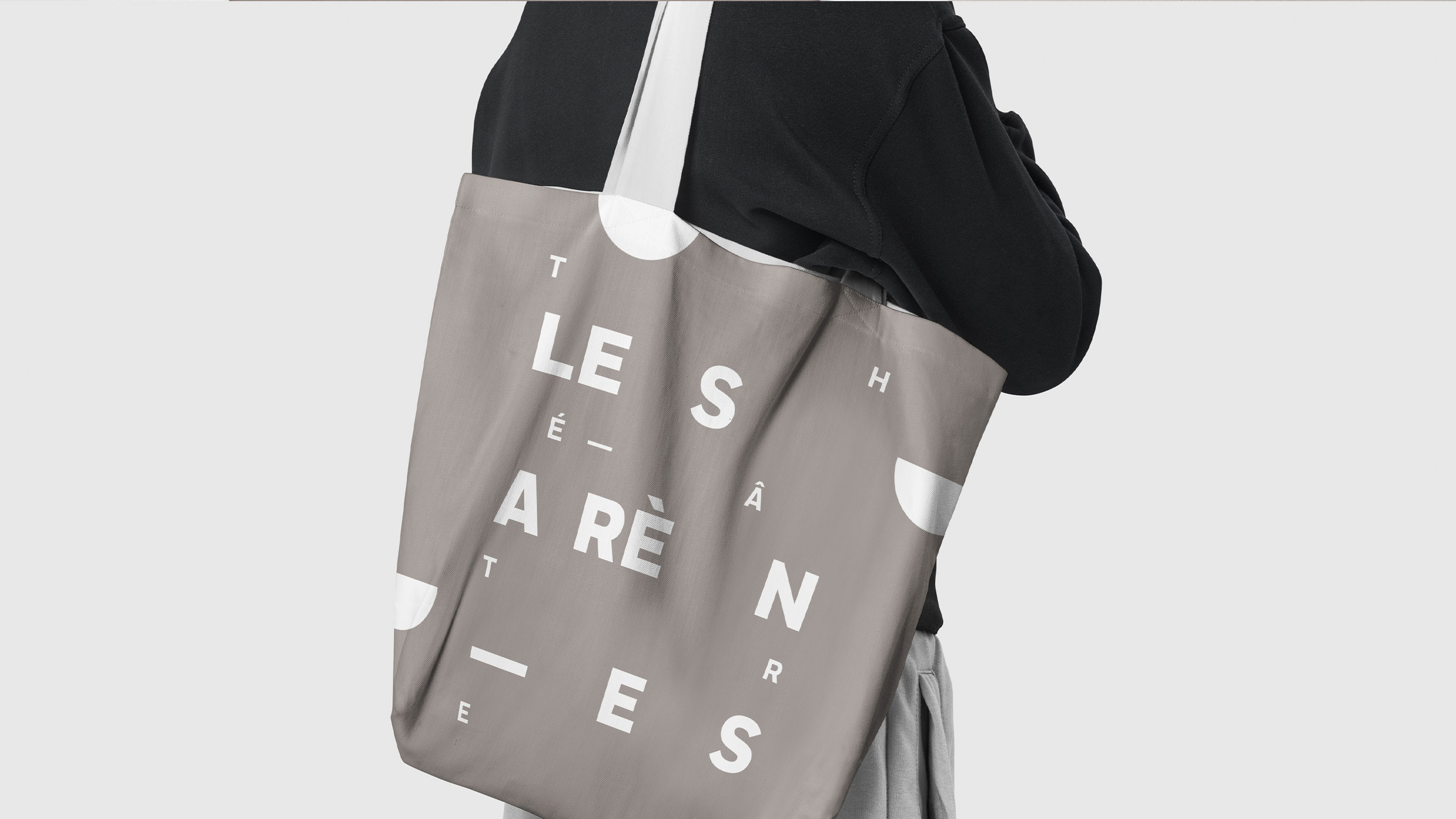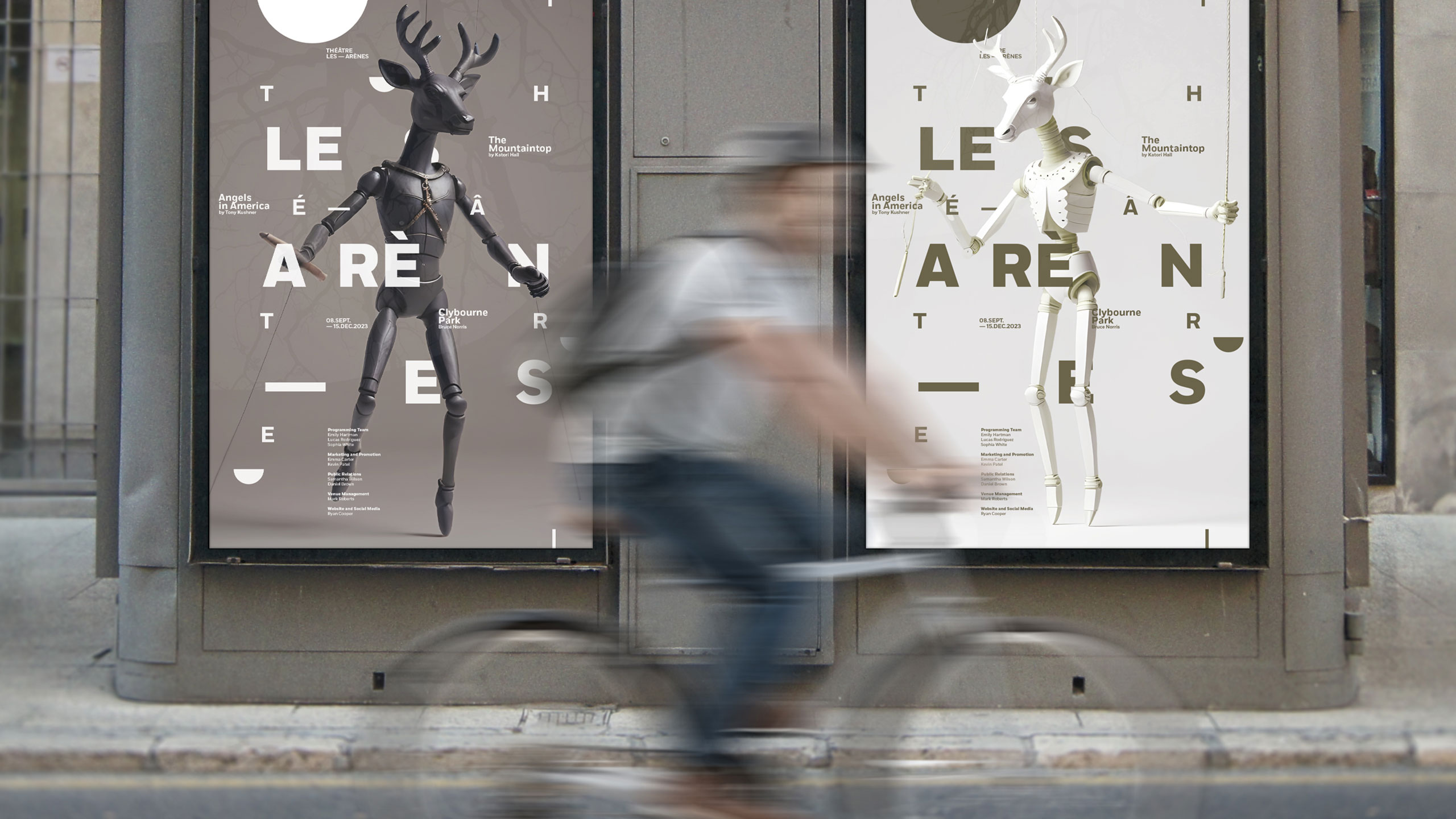 The visual identity of Théâtre Les Arènes is both poetic and modular, echoing the inventive spirit of its performances. Dominated by shades of grey and white, the design features a crescent moon logo symbolizing the shape of the theater’s arena. Typography appears as an assemblage of letters, reflecting the handmade, recomposed nature of the shows. At the heart of the imagery is a jointed puppet with a human body and a deer’s head, reinforcing a sense of whimsical, theatrical bricolage. This crafted, lyrical aesthetic is applied consistently across posters, t-shirts, tote bags, badges, and programs, creating a strong and memorable brand presence.