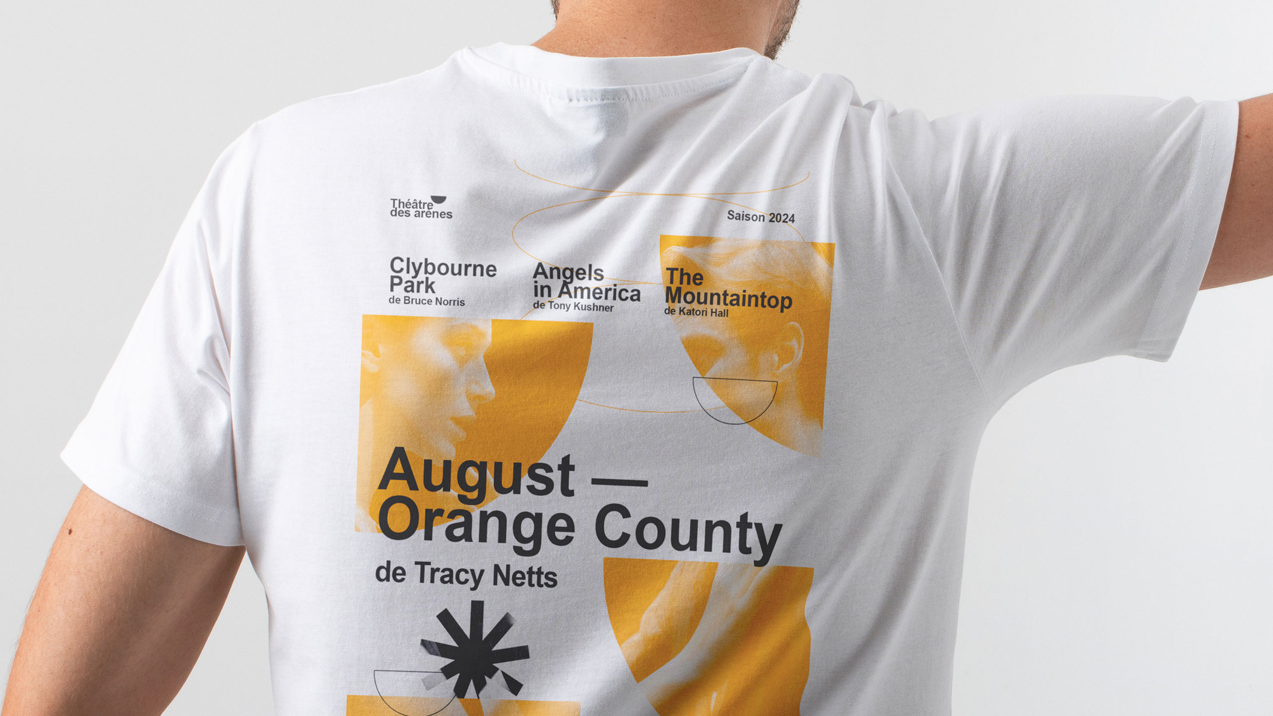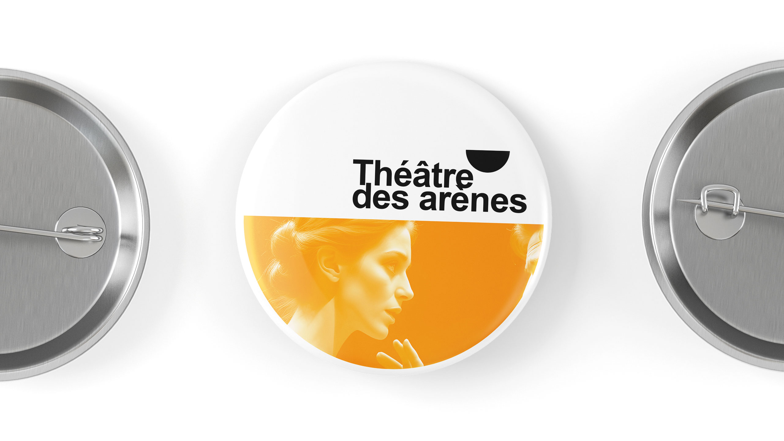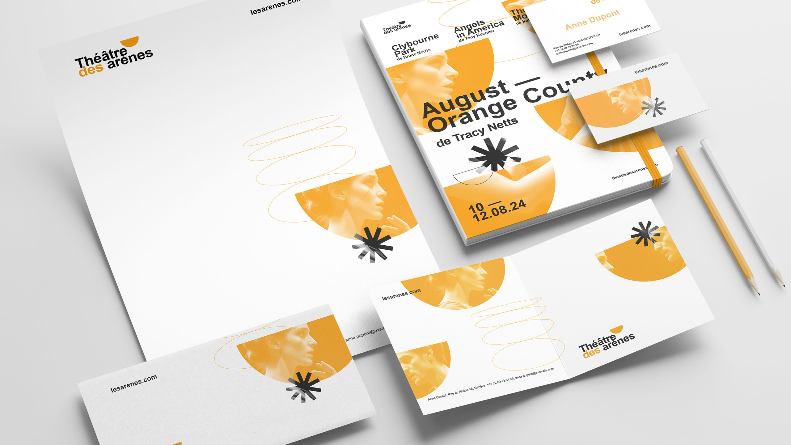 The visual identity of Théâtre Les Arènes features a bright, solar yellow as its dominant color, evoking energy, creativity, and visibility. The communication design is applied across posters, t-shirts, tote bags, badges, and stationery. A key graphic element is the use of the theater’s half-moon logo shape—echoing the architectural form of ancient arenas—which frames current production visuals and brings a dynamic rhythm to the layouts. This bold, circular motif is contrasted with a clean, structured typographic layout inspired by Swiss design, offering balance between contemporary vibrancy and classical clarity. The result is an identity both striking and elegant.