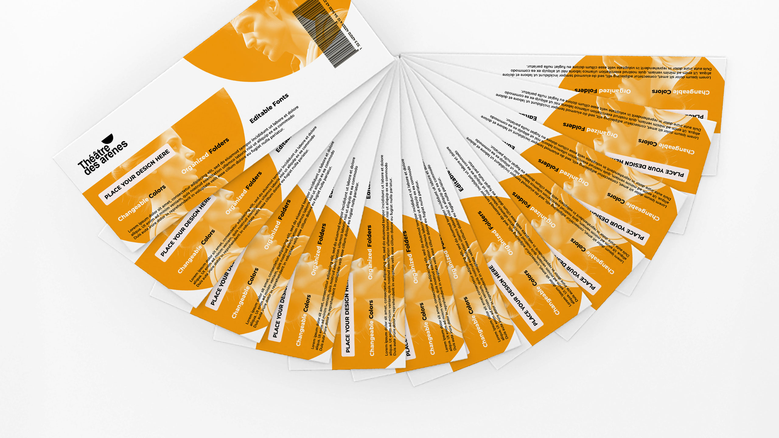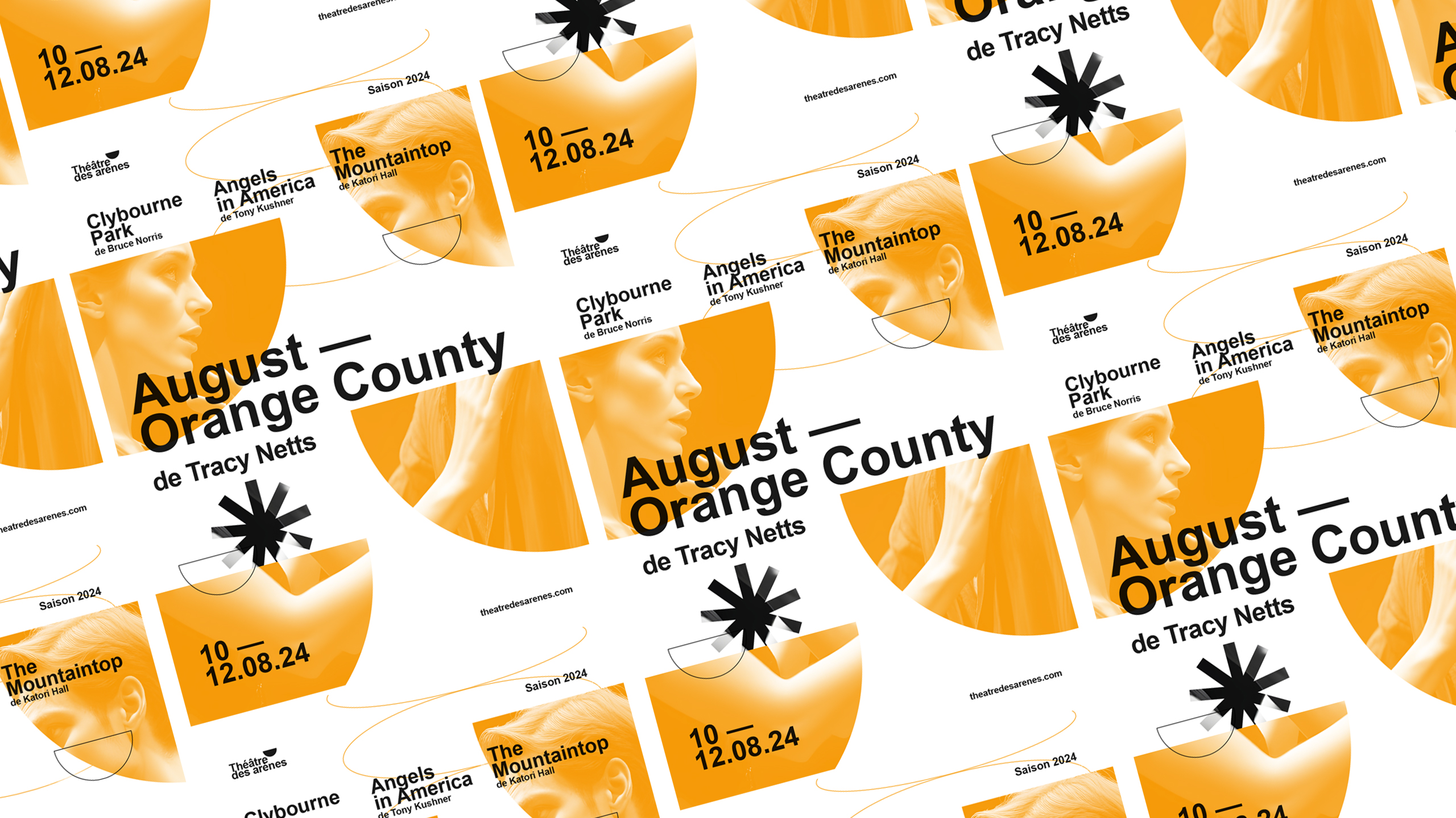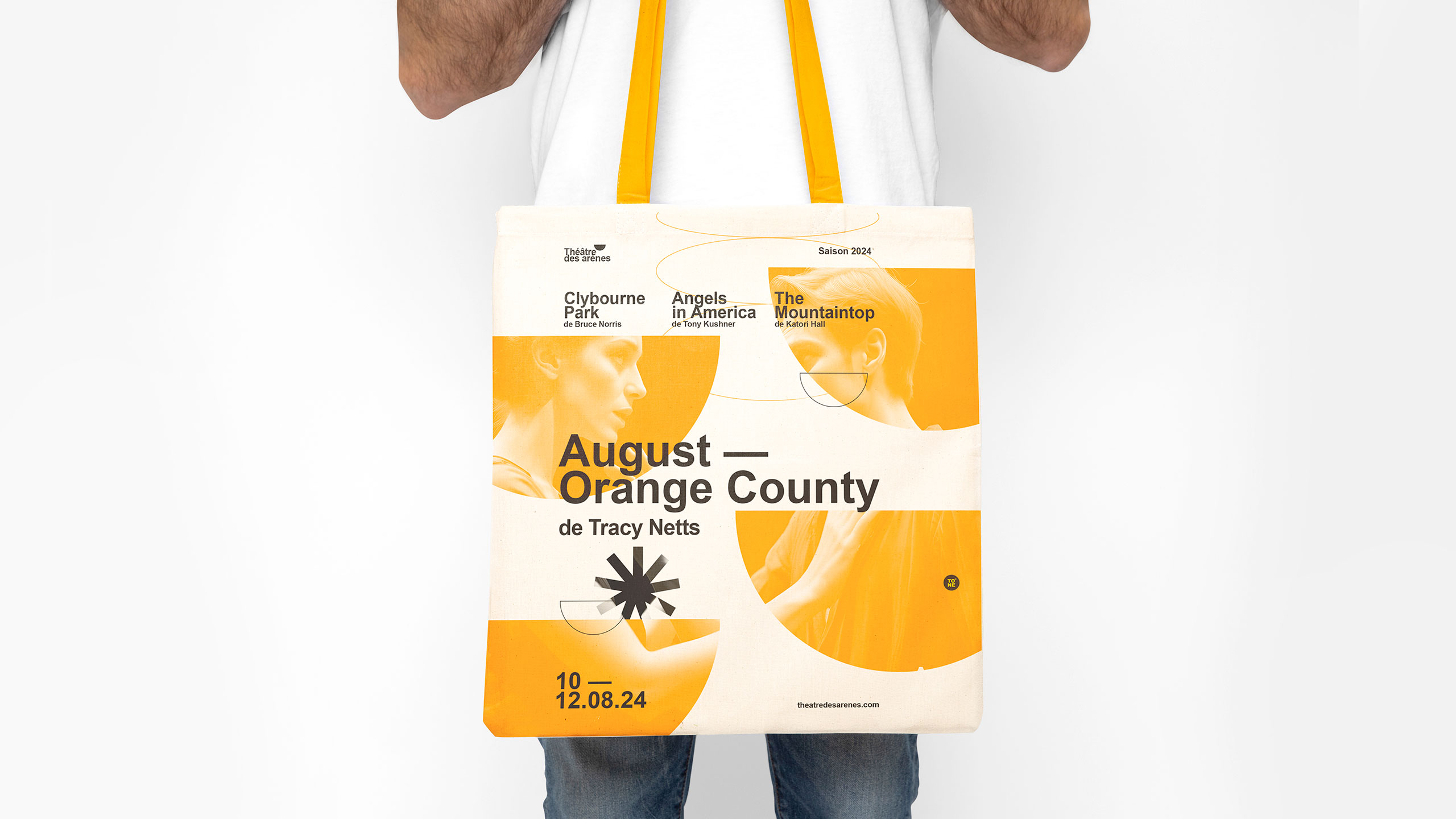 The visual identity of Théâtre Les Arènes features a bright, solar yellow as its dominant color, evoking energy, creativity, and visibility. The communication design is applied across posters, t-shirts, tote bags, badges, and stationery. A key graphic element is the use of the theater’s half-moon logo shape—echoing the architectural form of ancient arenas—which frames current production visuals and brings a dynamic rhythm to the layouts. This bold, circular motif is contrasted with a clean, structured typographic layout inspired by Swiss design, offering balance between contemporary vibrancy and classical clarity. The result is an identity both striking and elegant.